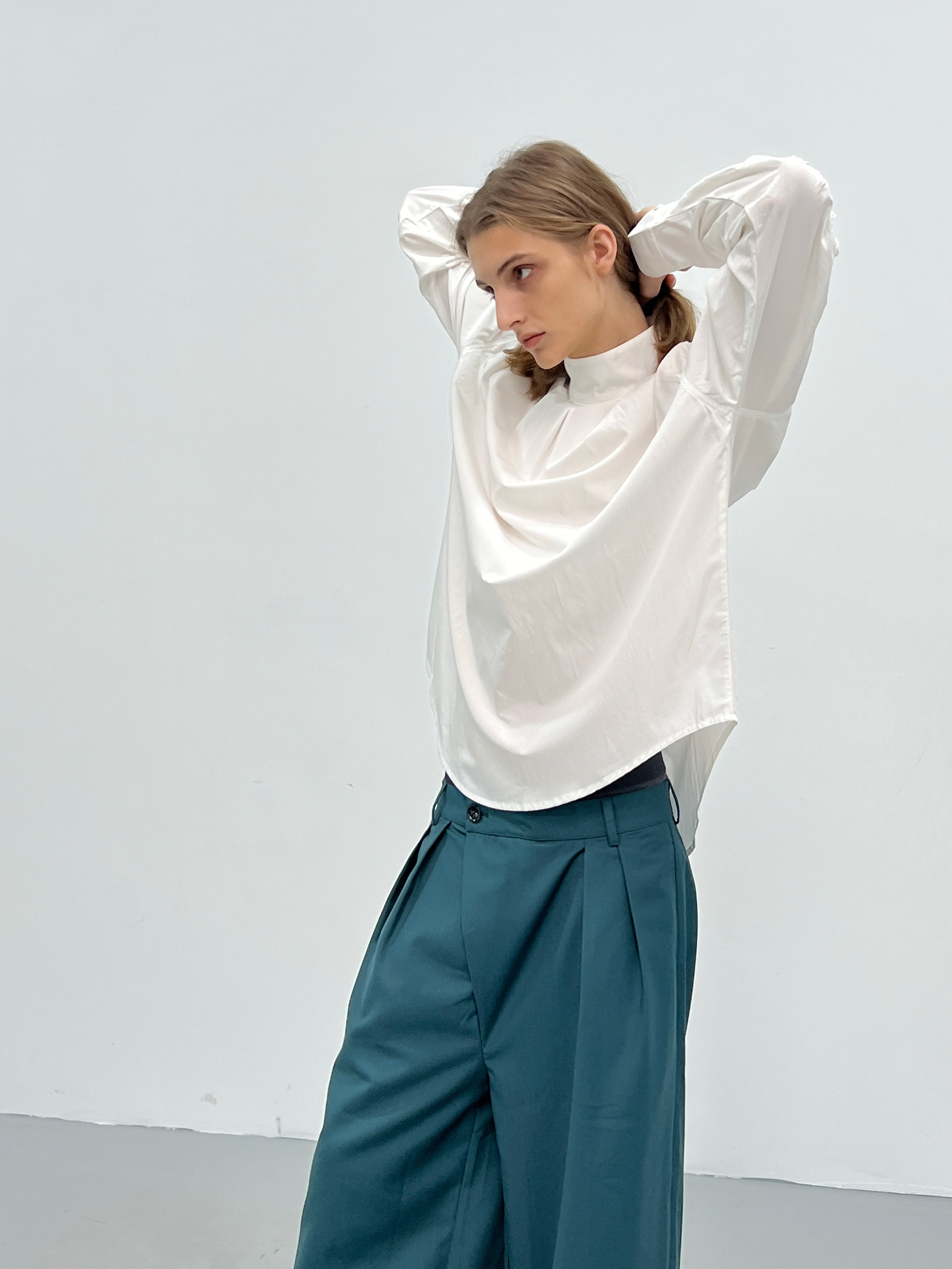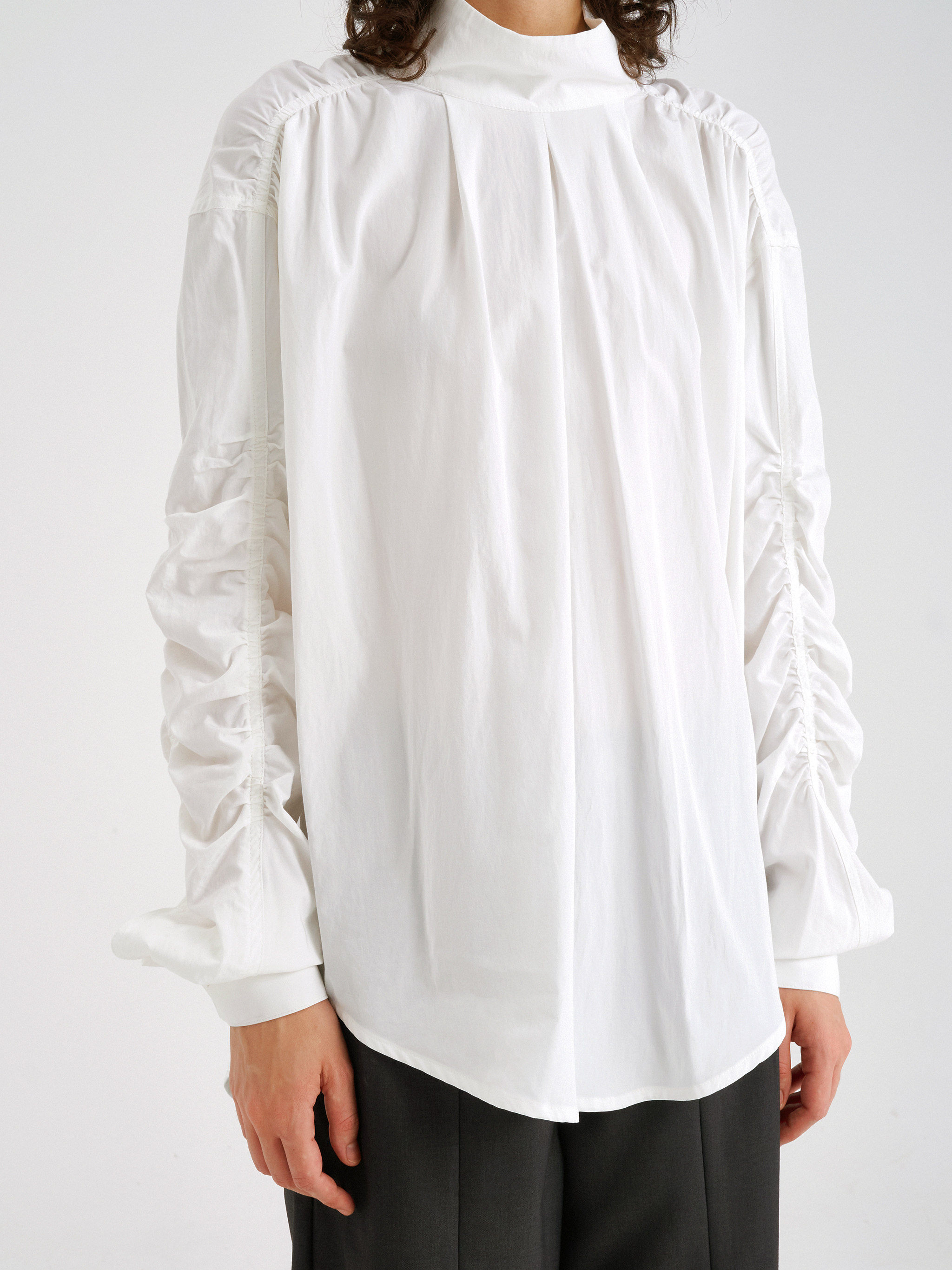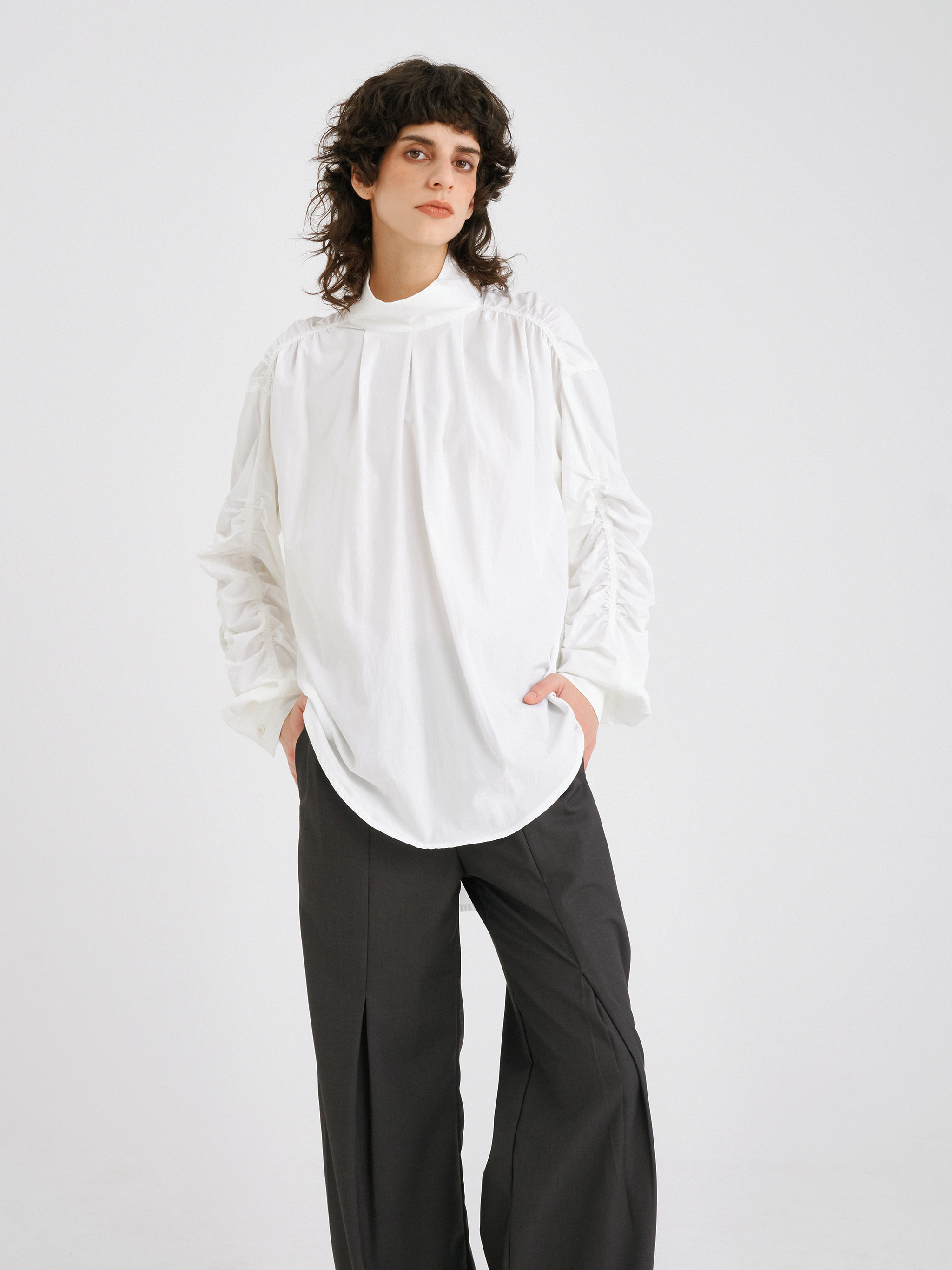 INCOG清仓不退原创设计无性别褶皱袖半高领高级感白色衬衫