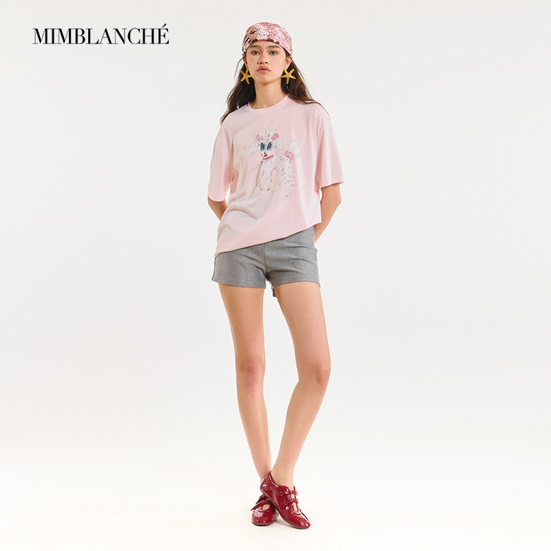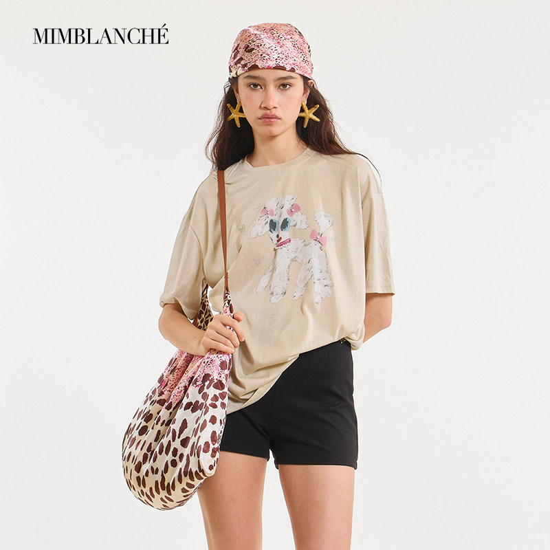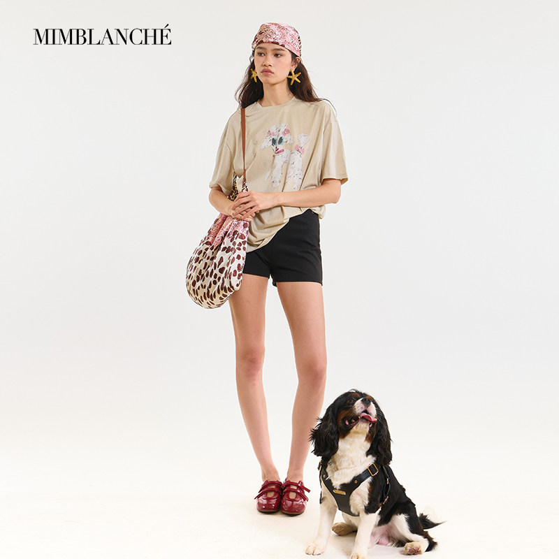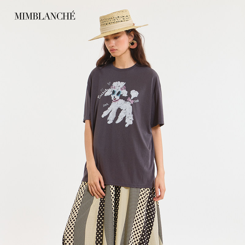 MIMBLANCHE夏季新款宽松圆领索尼亚小狗印花短袖T恤女