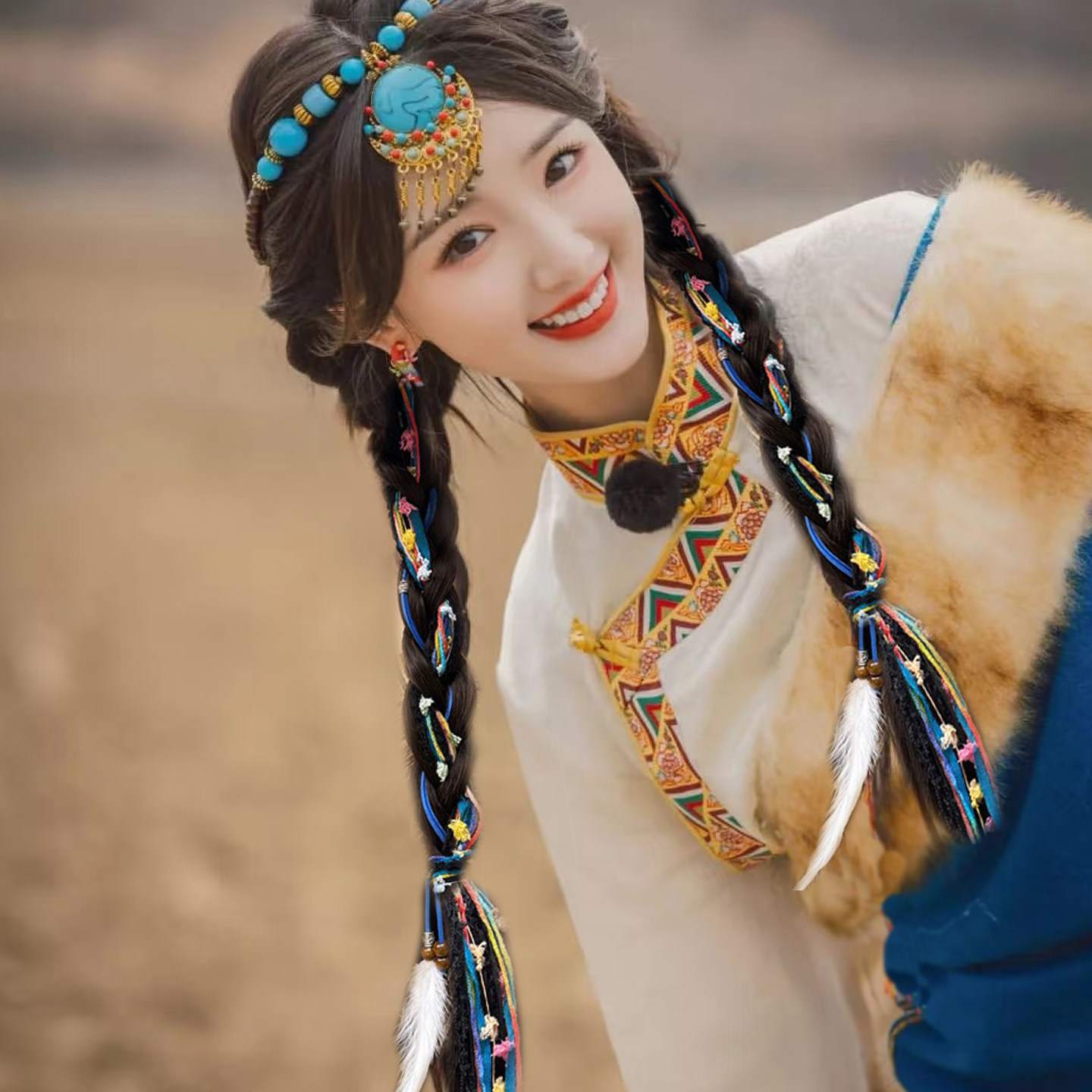 藏族编发渐变彩色头绳民族风小众毛线长款飘带发夹绑发麻花辫发绳