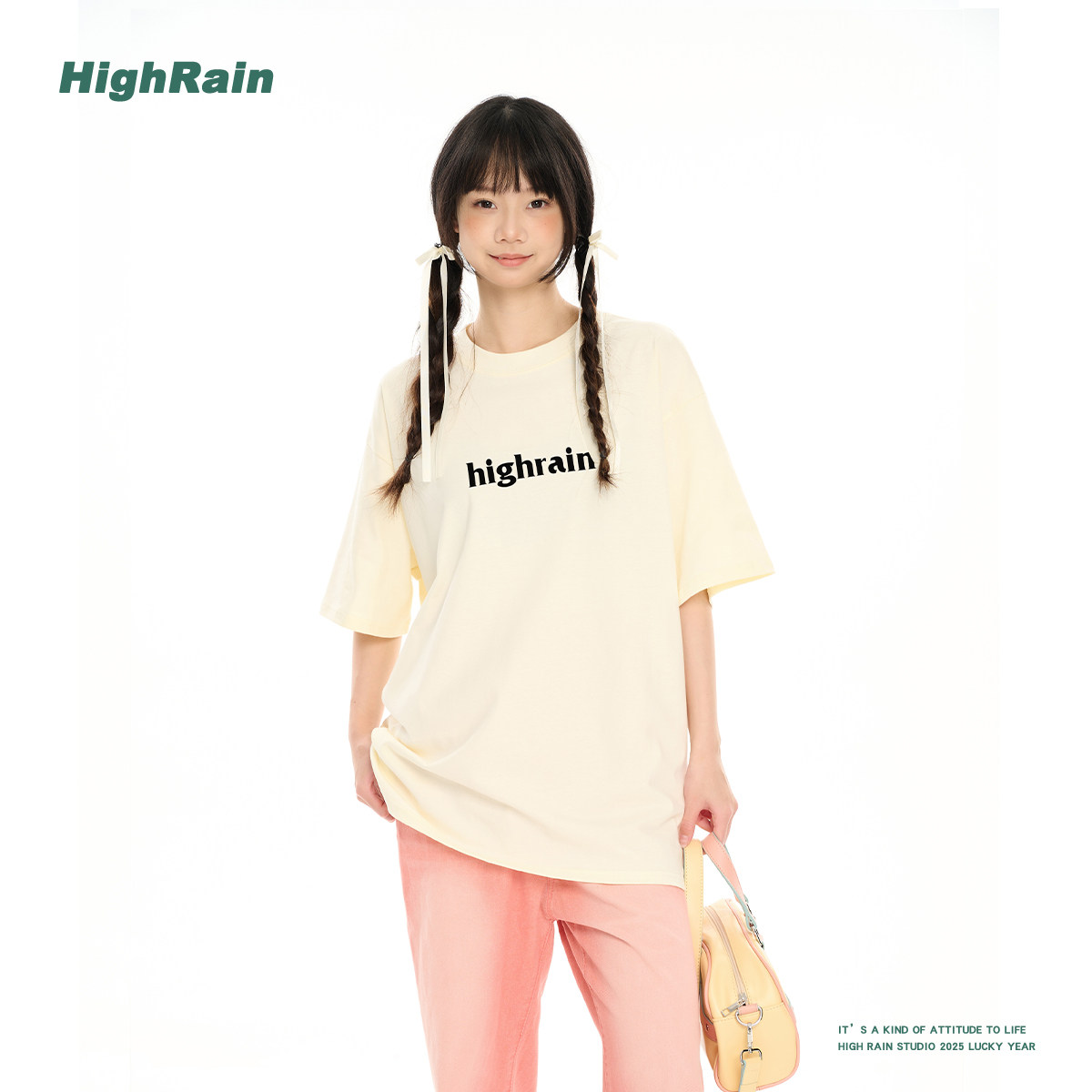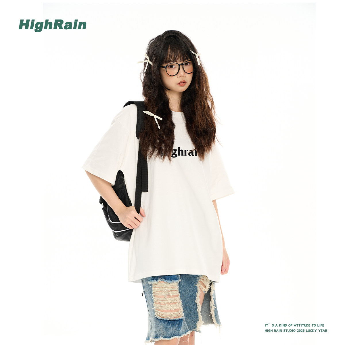HIGH RAIN 2025新款简约字母印花短袖T恤女夏季百搭宽松情侣上衣