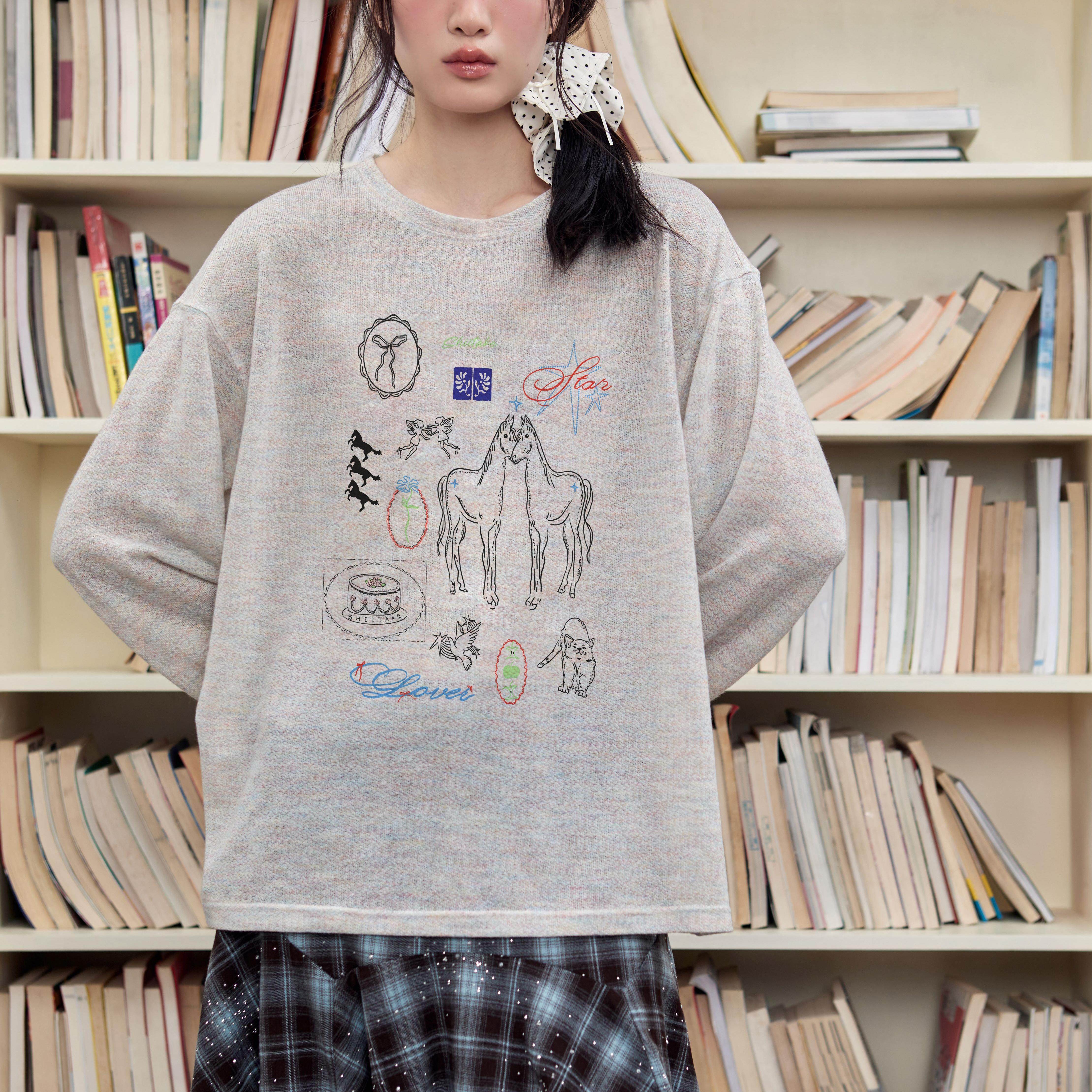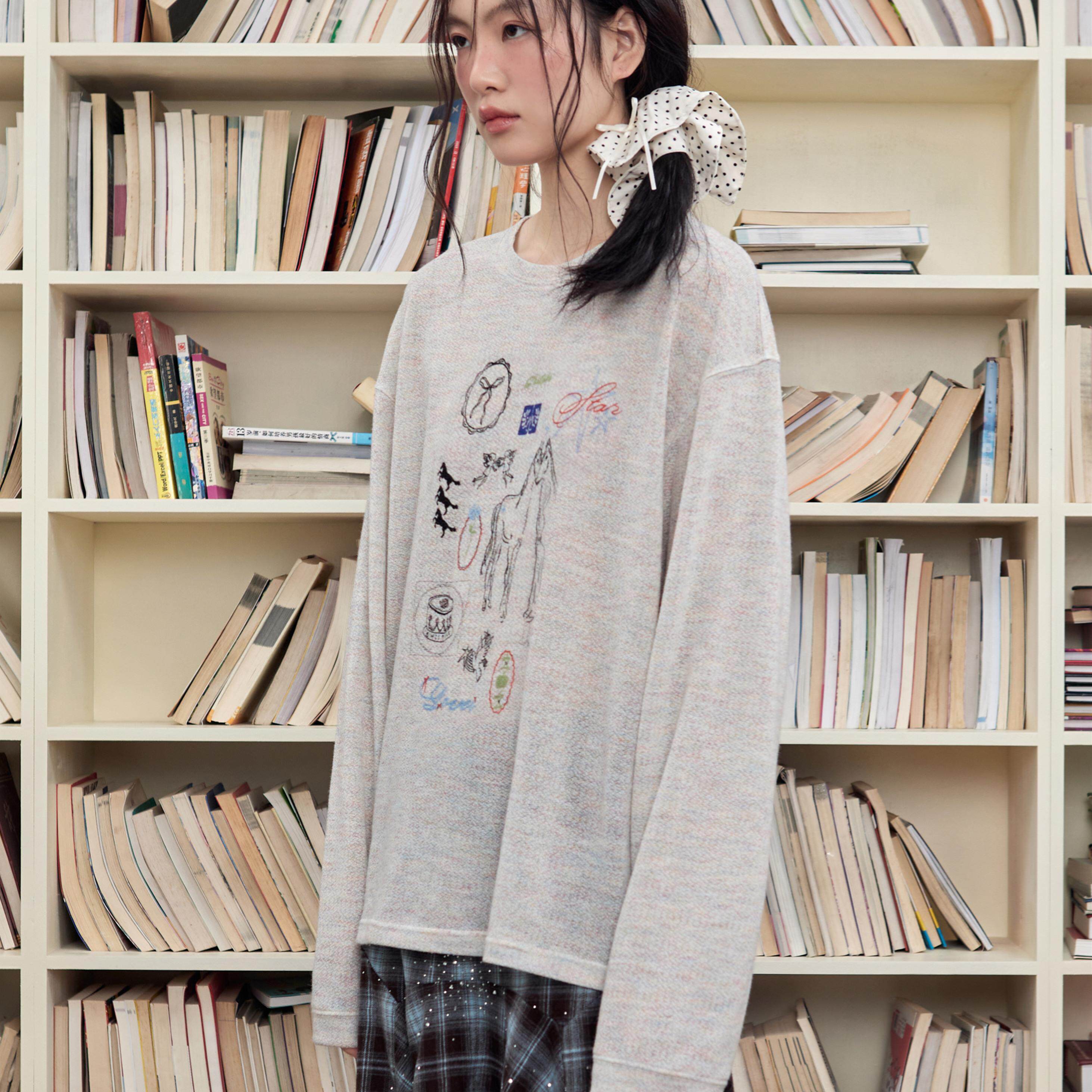 Shiitake 彩铅手绘涂鸦宽松长袖T恤内搭