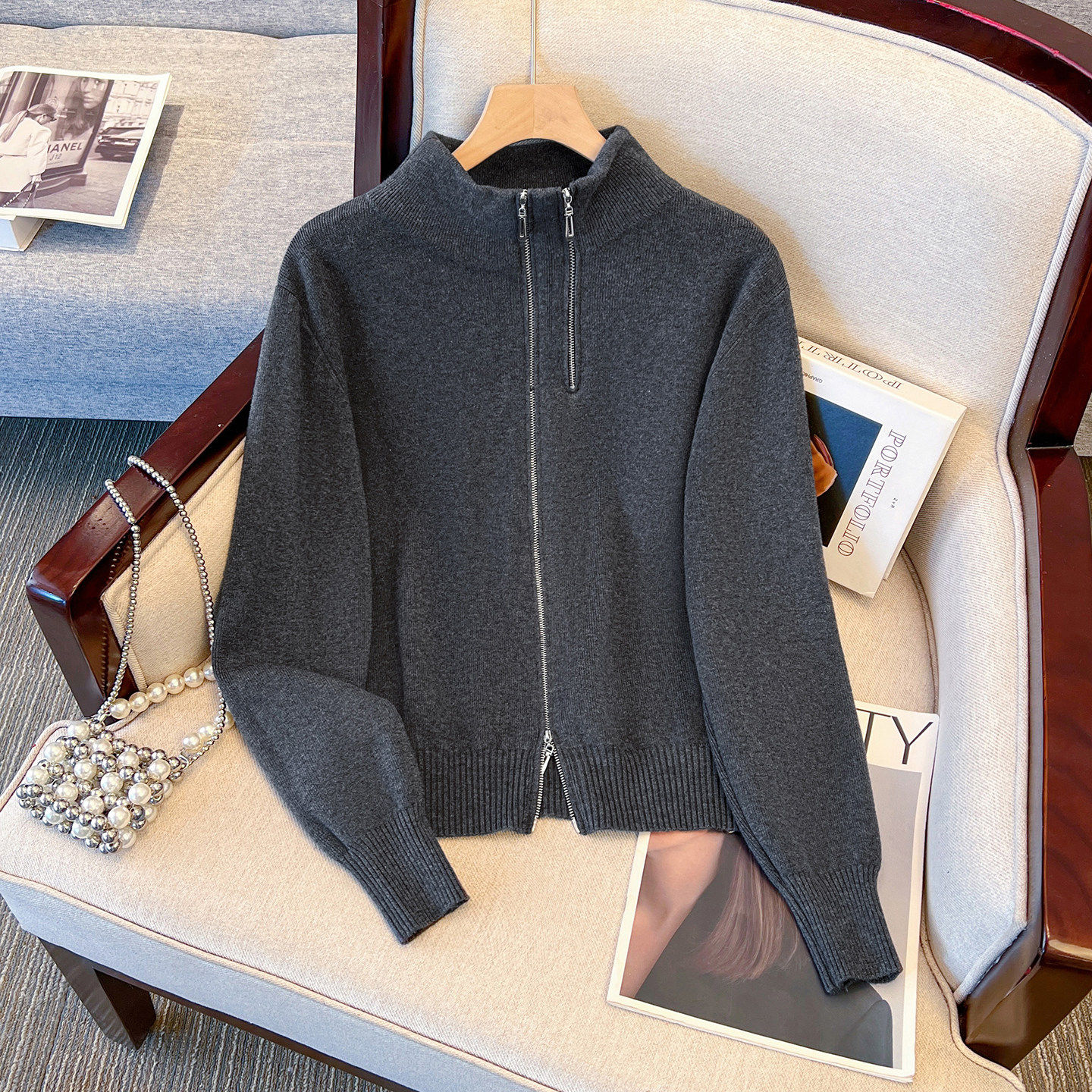 灰色毛衣半高领针织内搭打底衫女2026秋冬新款立领拉链外套可外穿