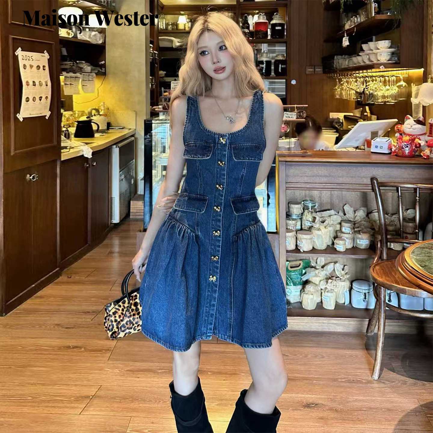 Maison Wester2025秋季新品流行复古蓝色牛仔大口袋款连衣裙