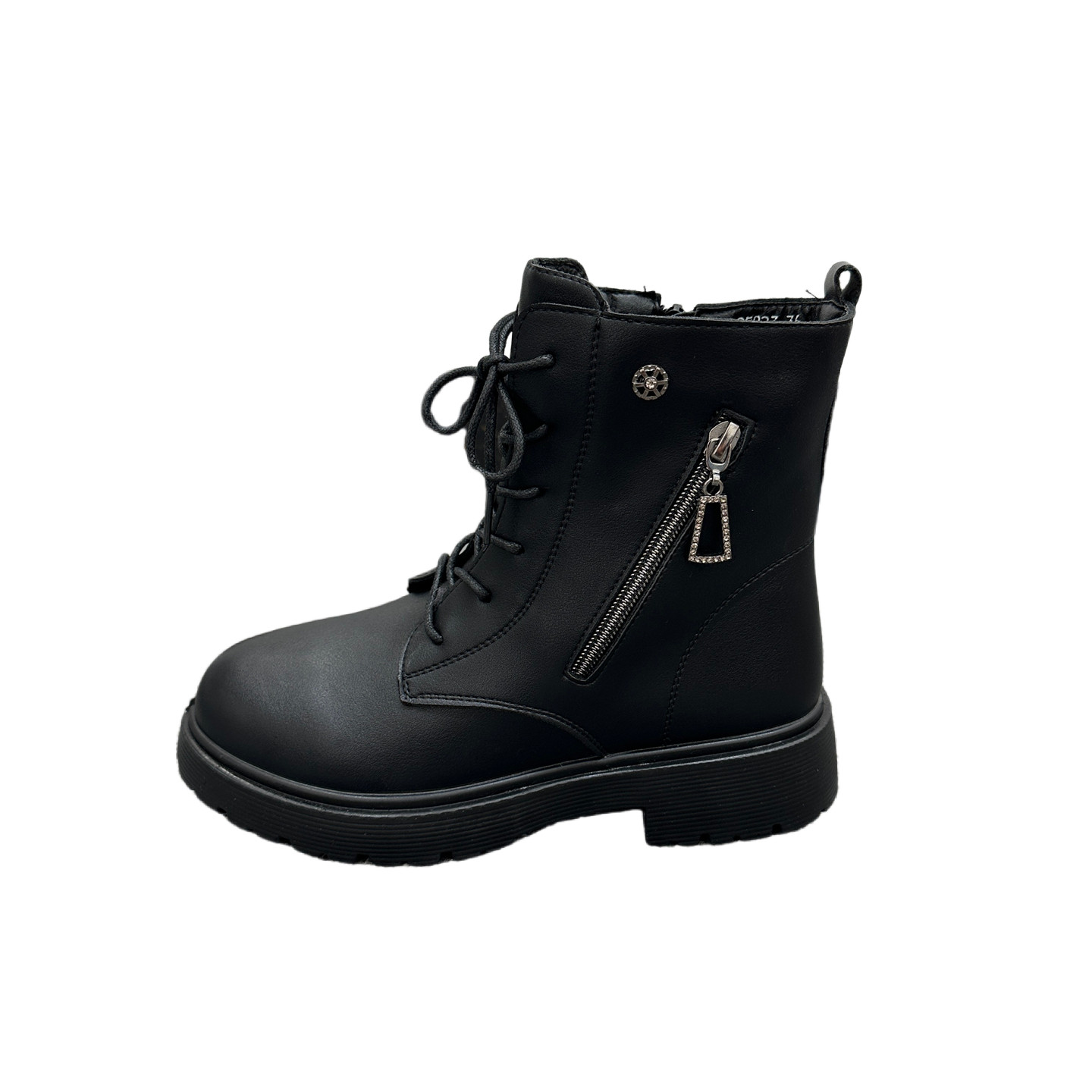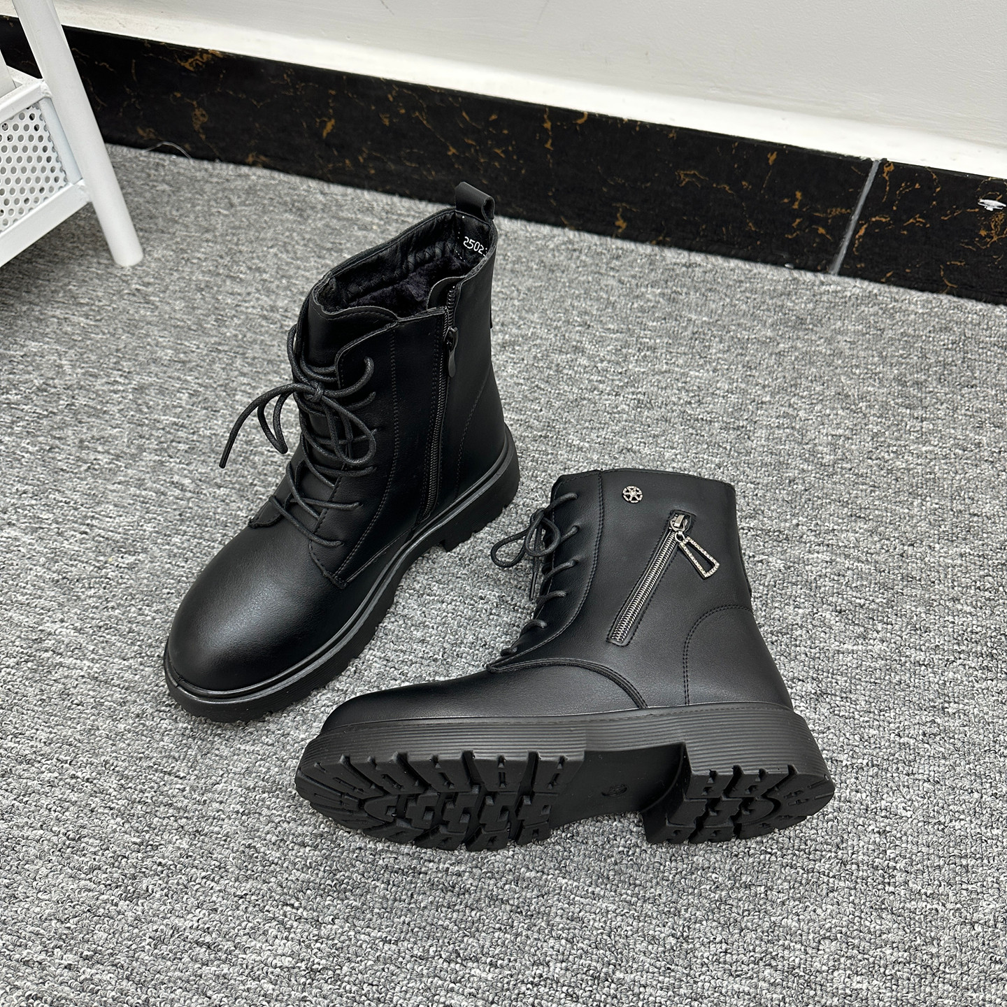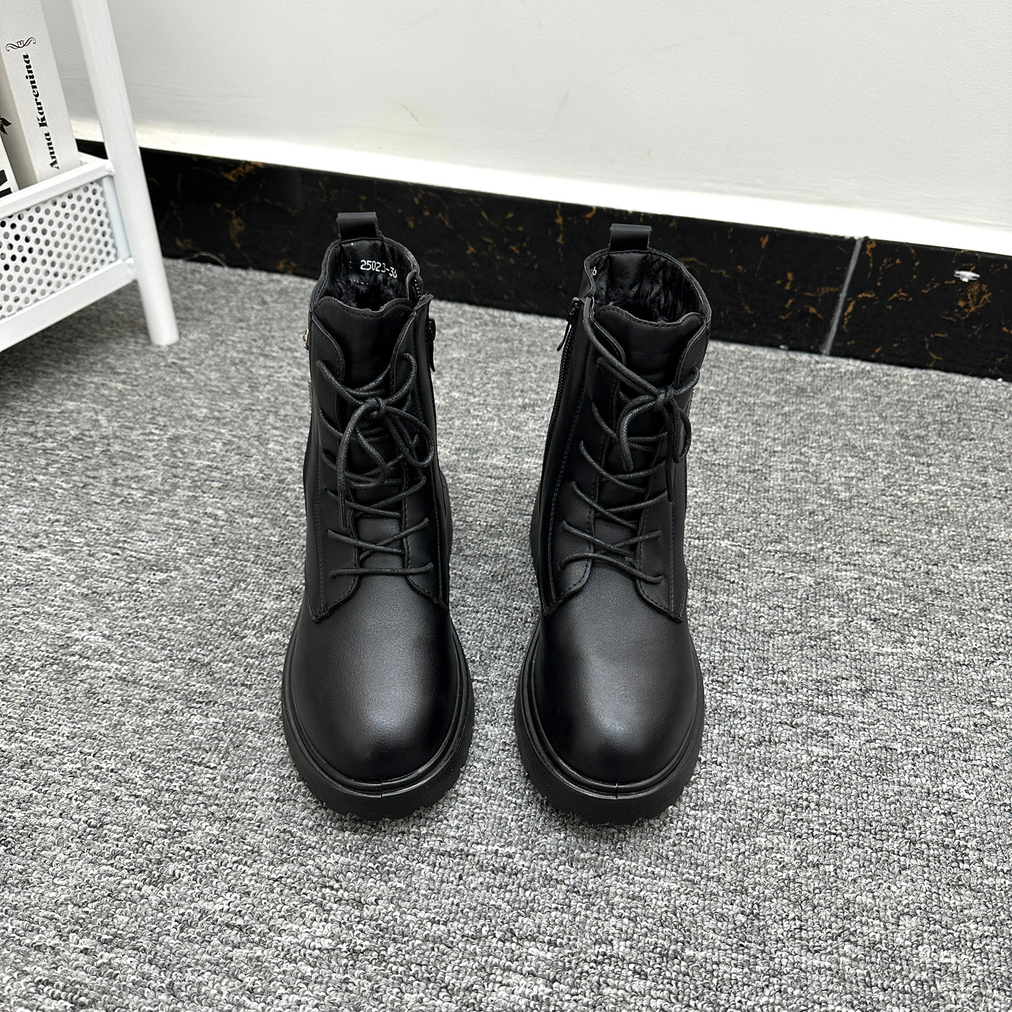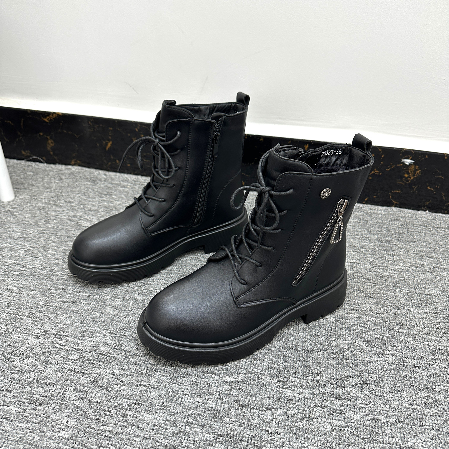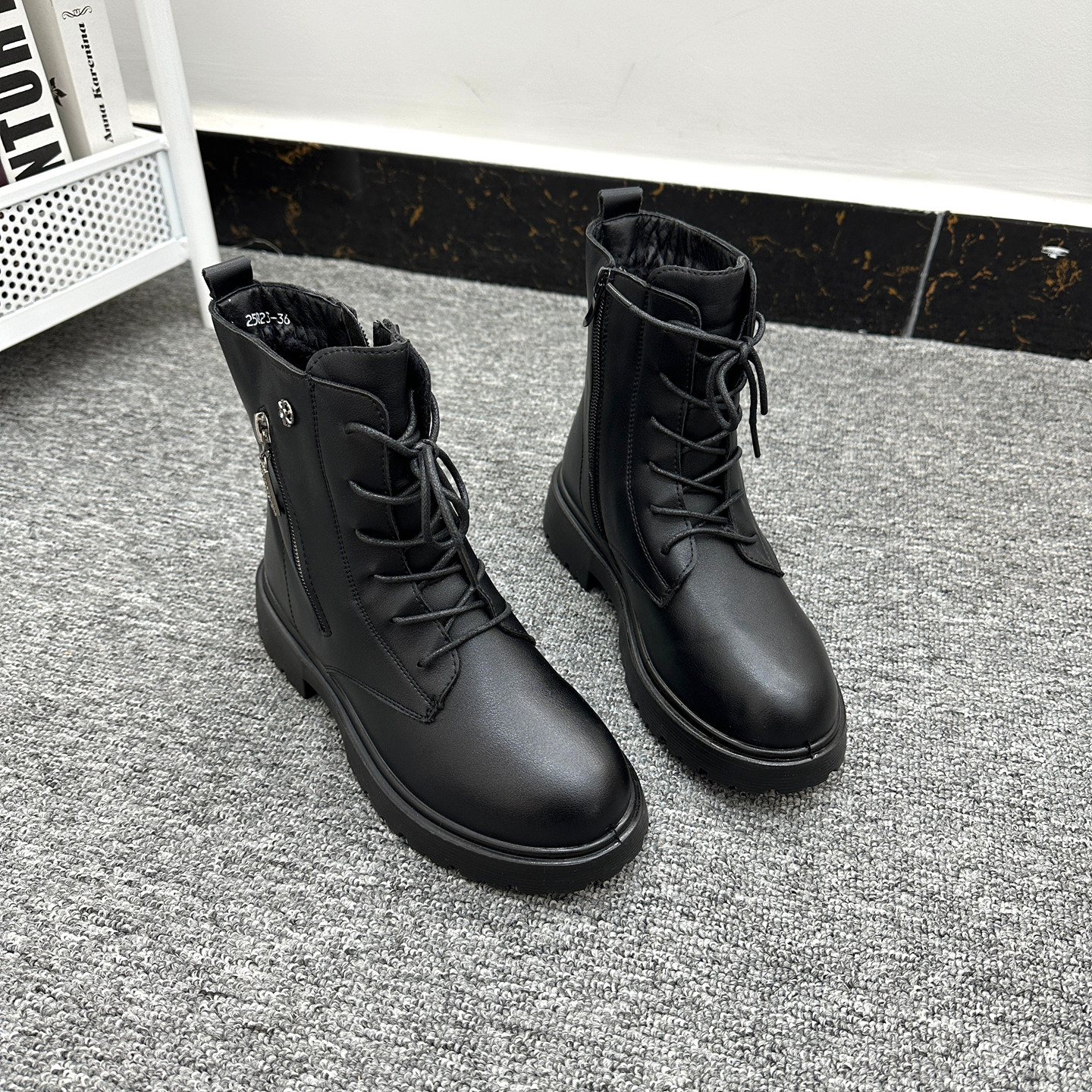 匠心品质!外贸Y单厚底防滑短靴女圆头侧拉链系带加绒机车马丁靴