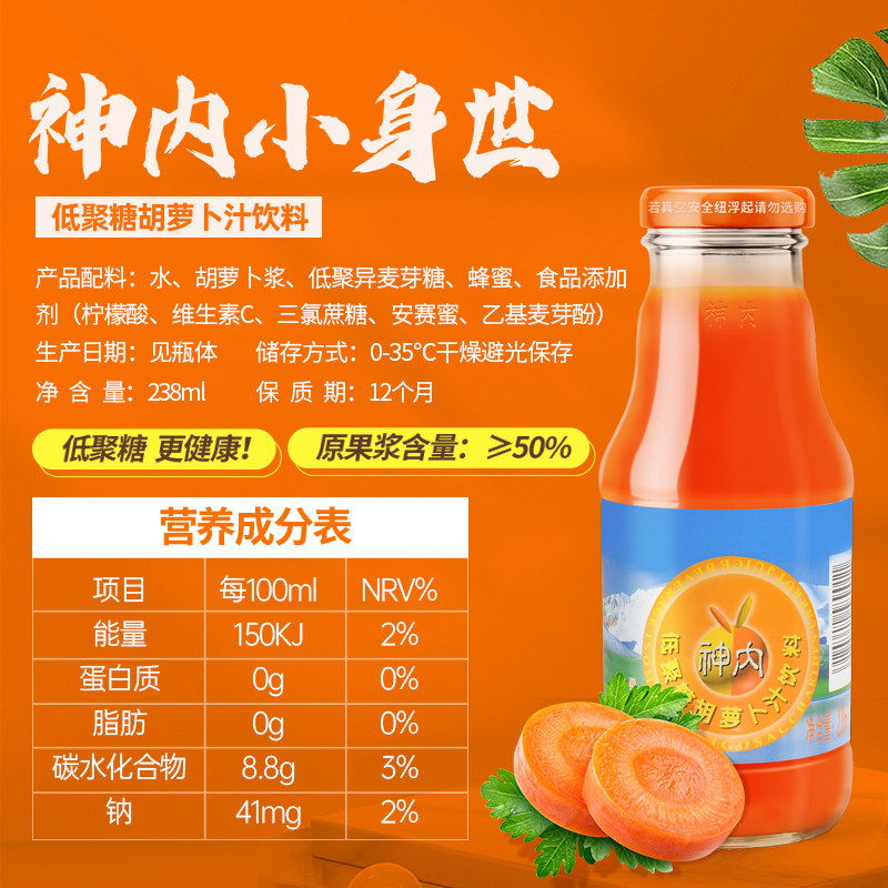 神内低聚糖胡萝卜汁新疆健康果蔬汁238ml*20瓶0蔗糖0脂肪饮料包邮