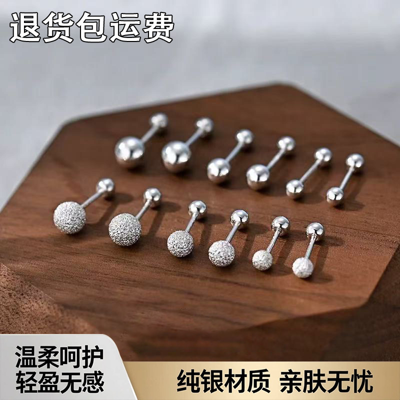 S999纯银耳骨钉女睡觉免摘耳钉男螺丝拧扣双头耳环养耳足银潮银饰