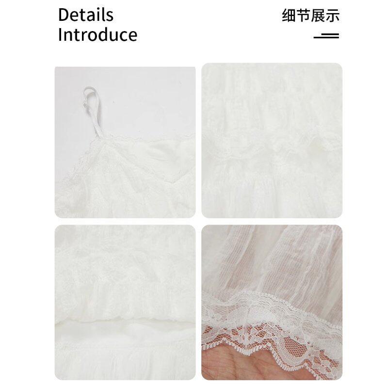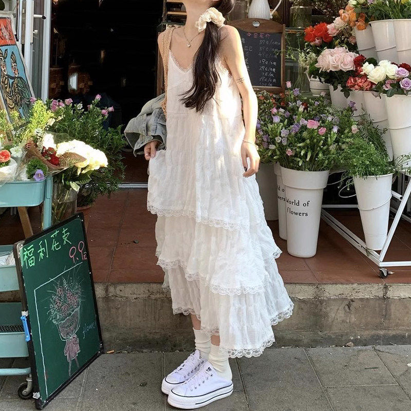 白色吊带洋装女夏日绝美无袖蛋糕长裙子高级新款小心机小众蕾丝