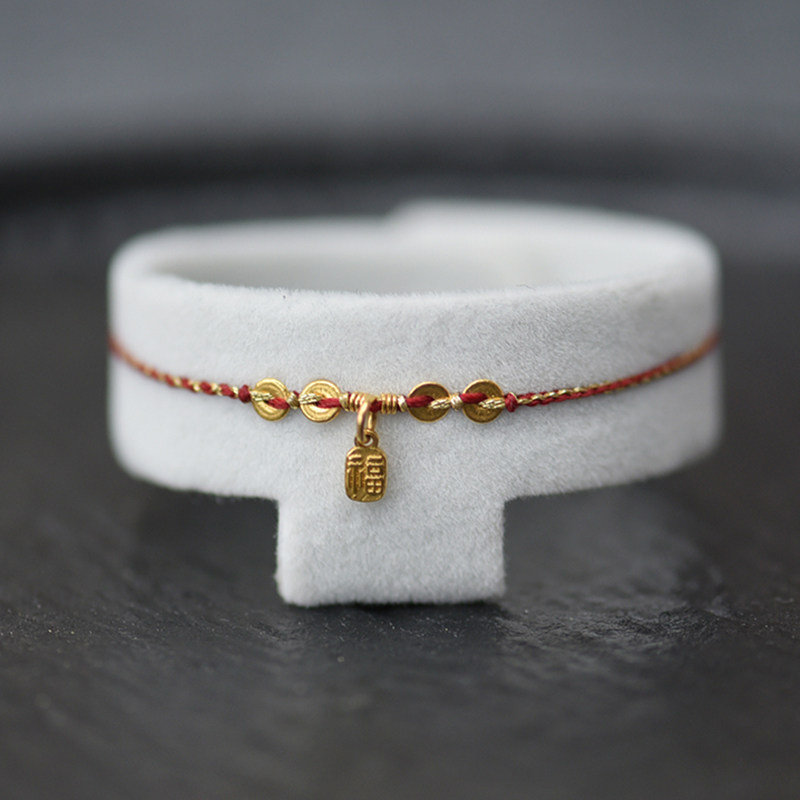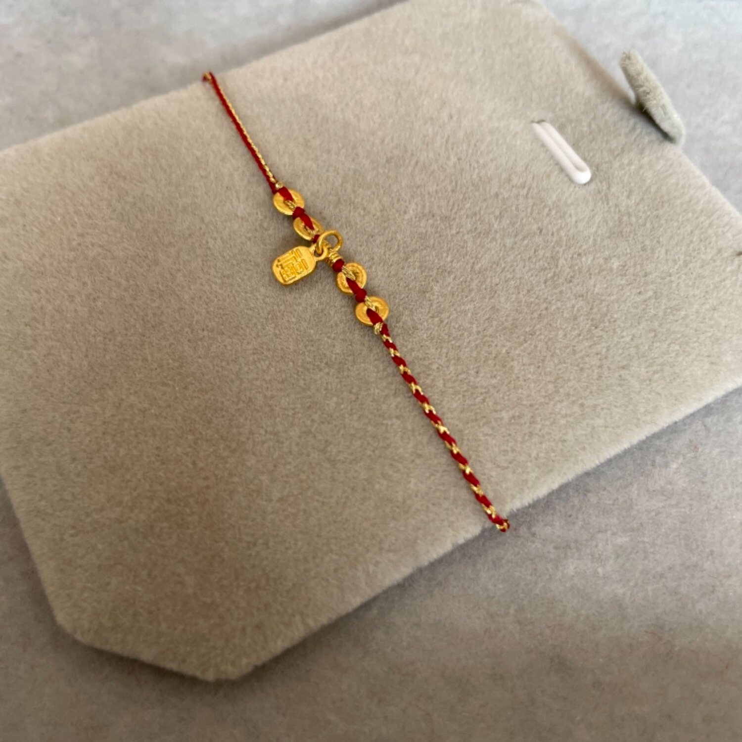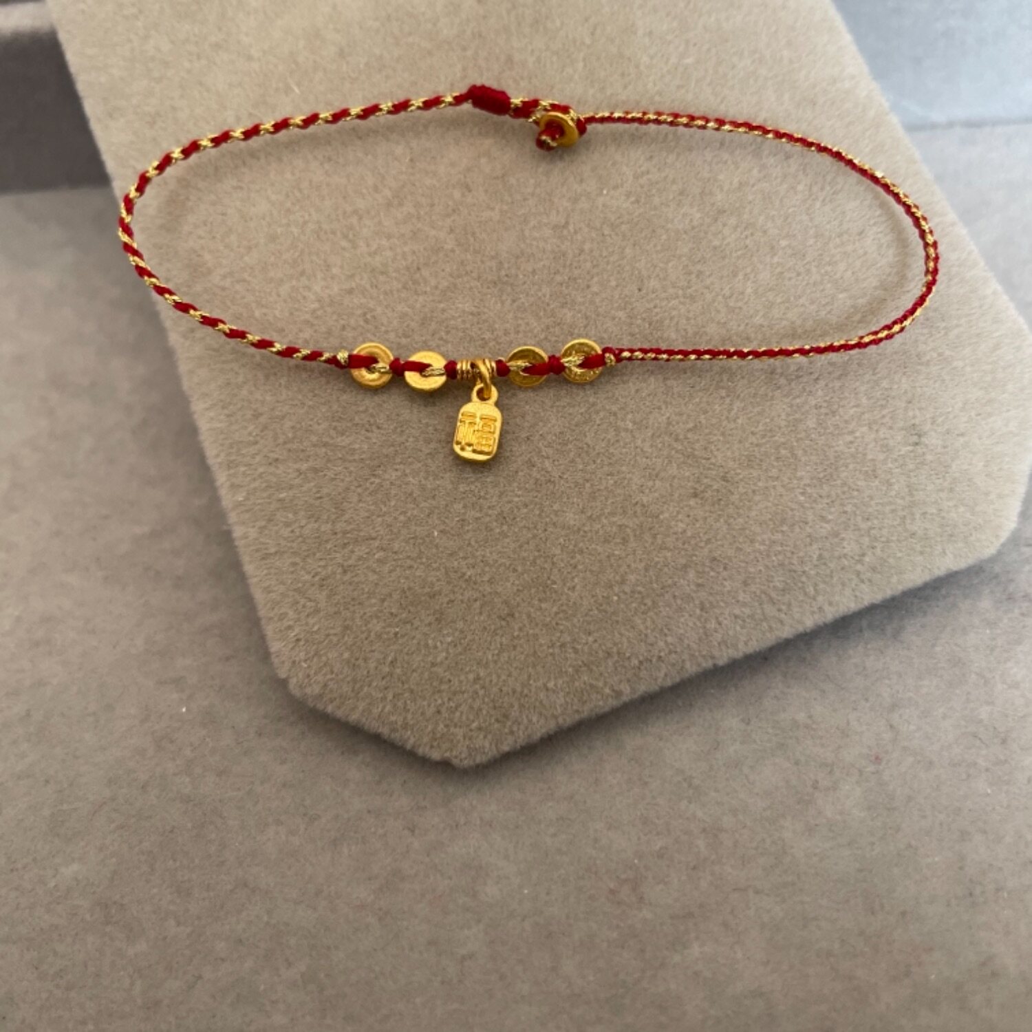 超细纯手工编织足金999黄金小福牌本命年手工编织红绳手链脚链女