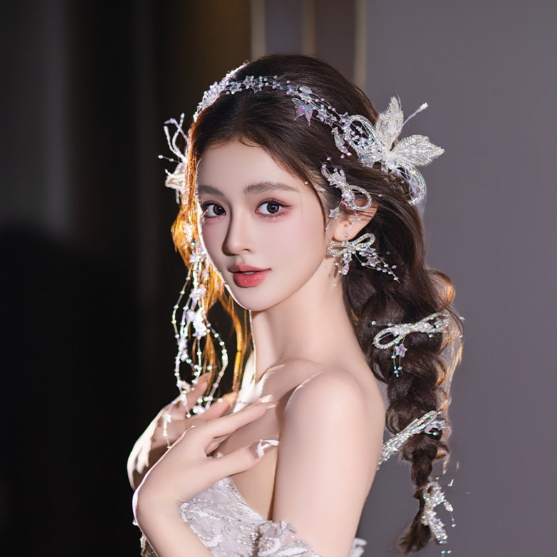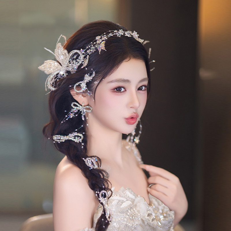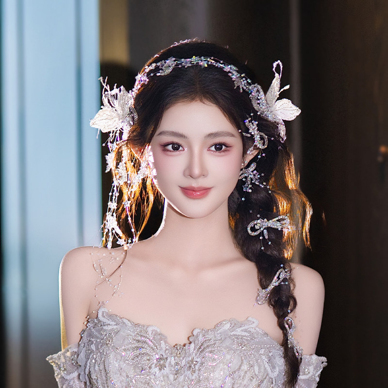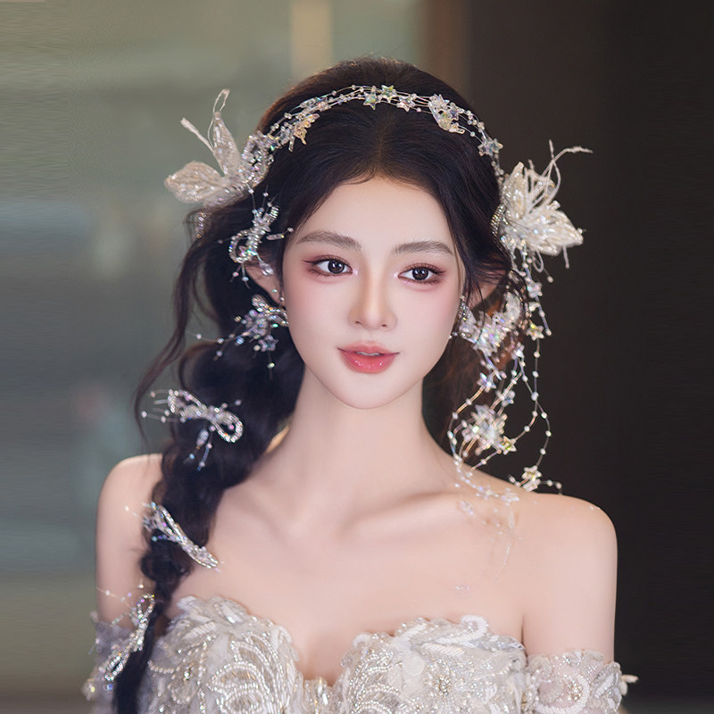 新款婚纱新娘头饰超仙韩系精致甜美蝴蝶透明水晶公主减龄婚礼发饰