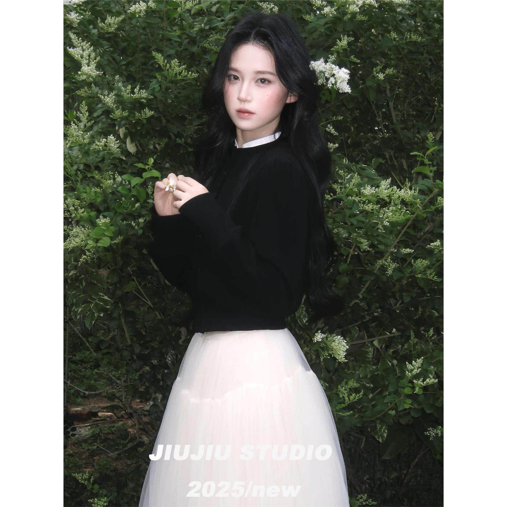 黑色拼接毛衣女早秋新款覆古韩系圆领长袖显瘦针织开衫短外套上衣