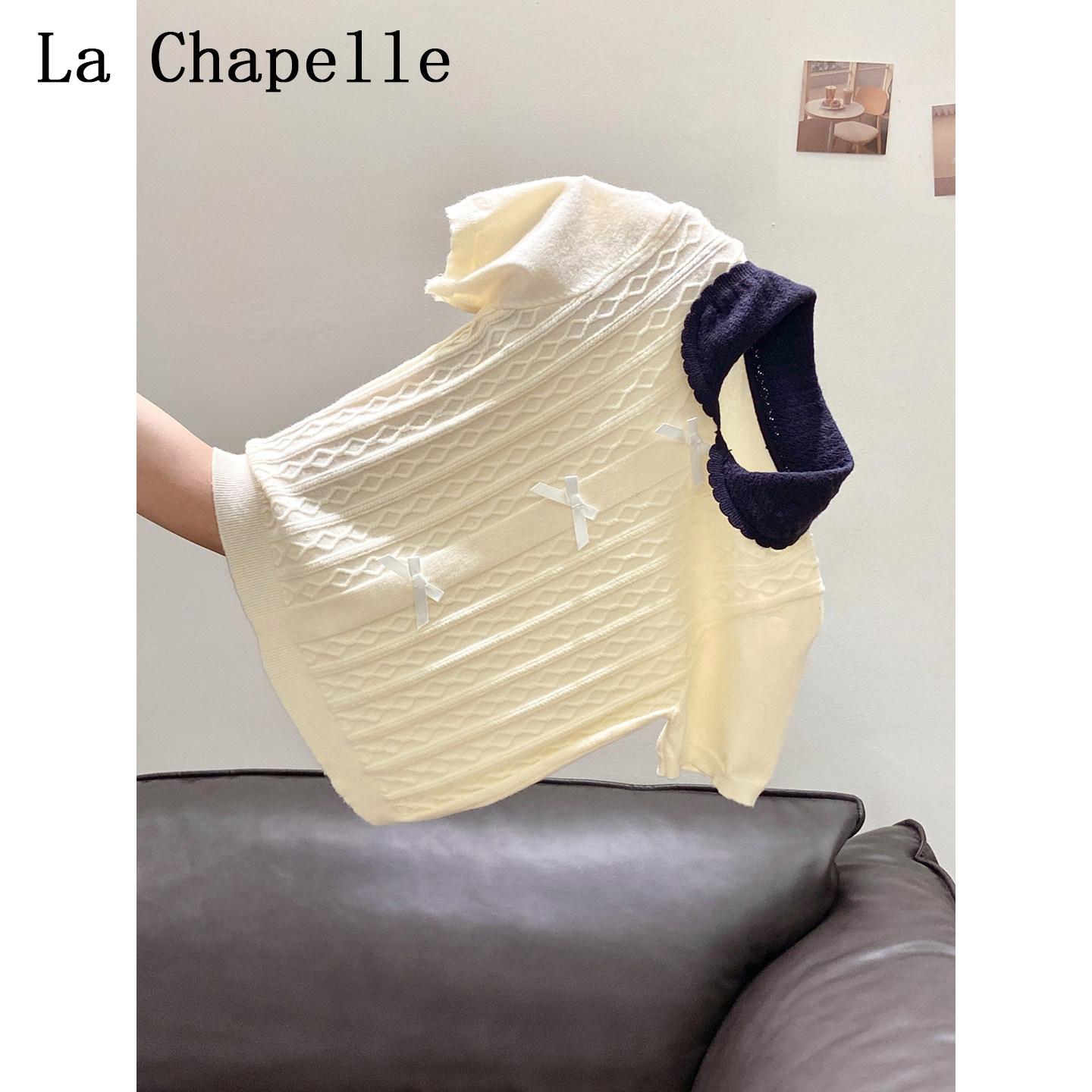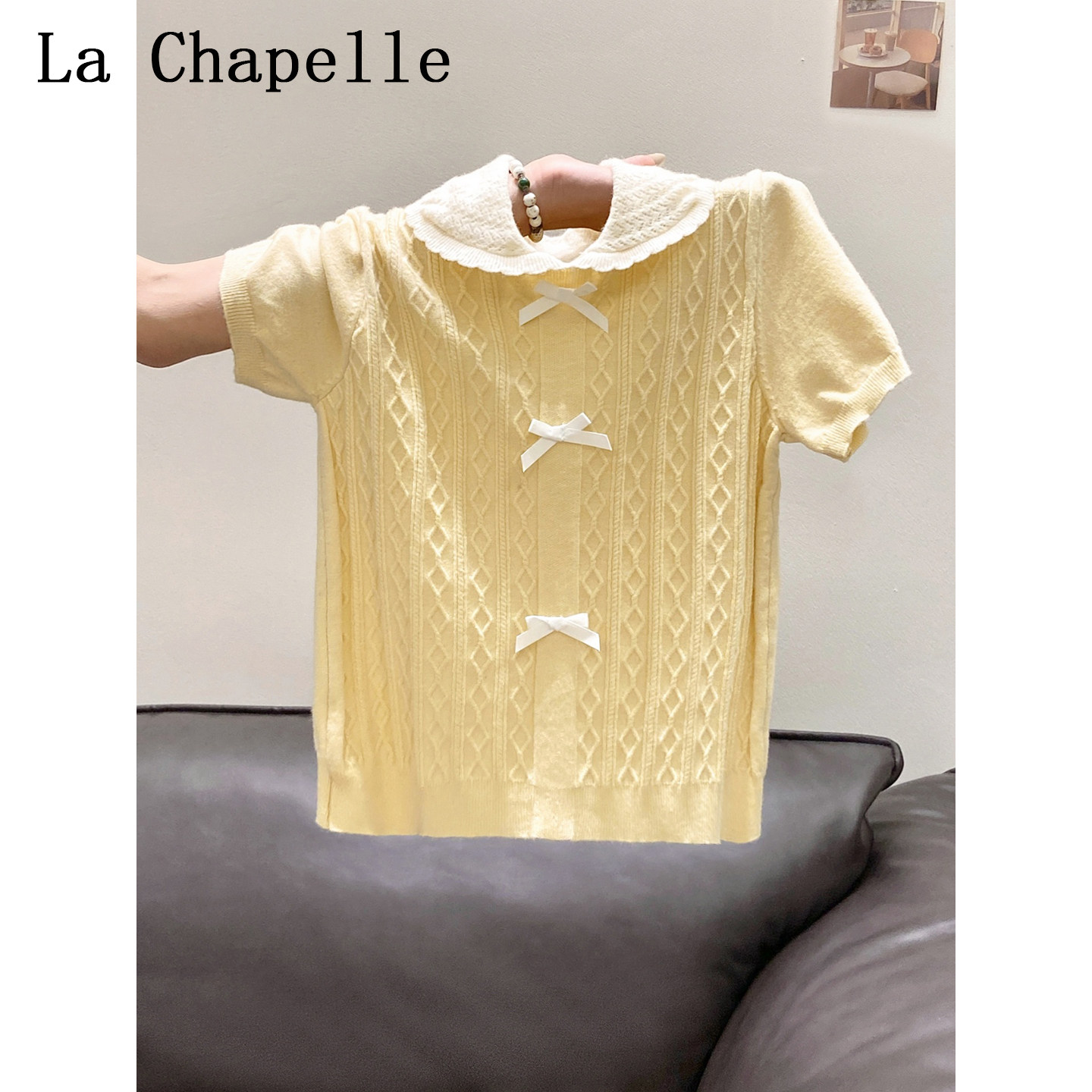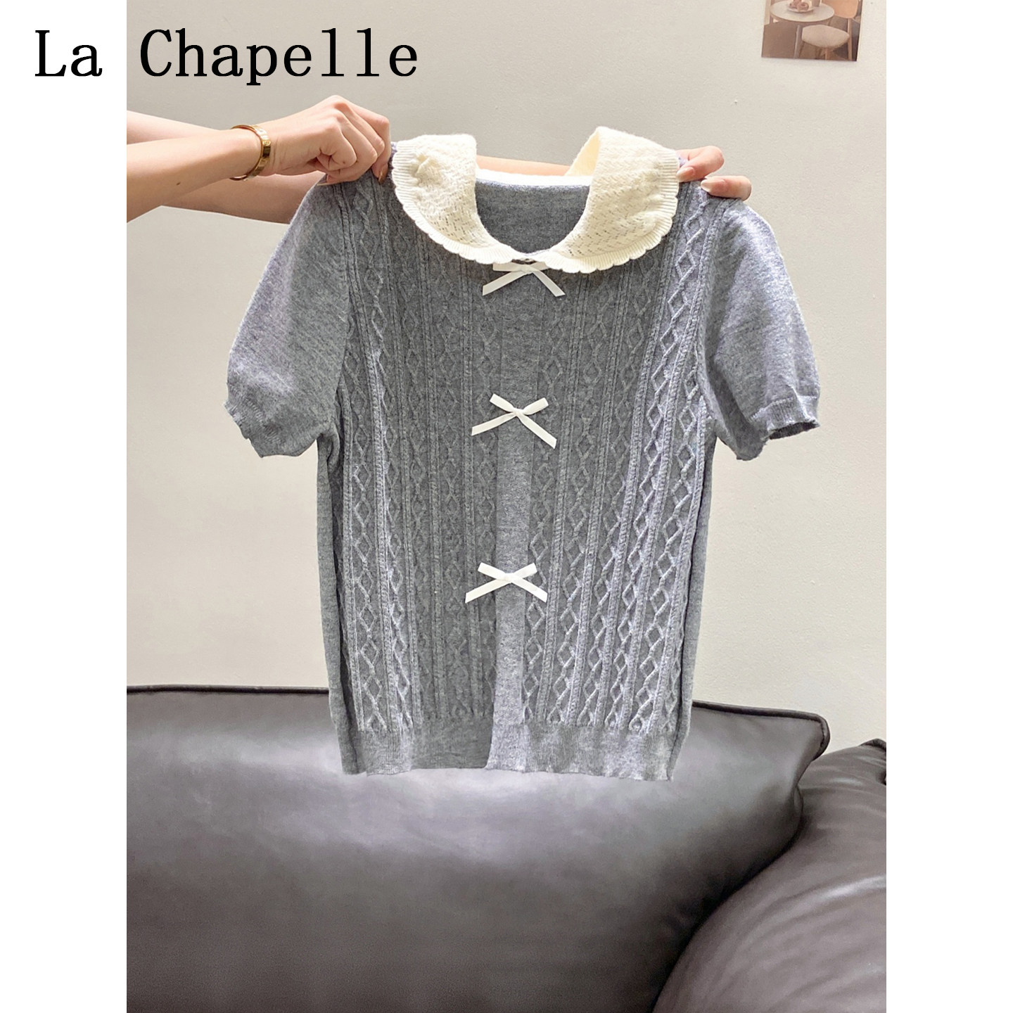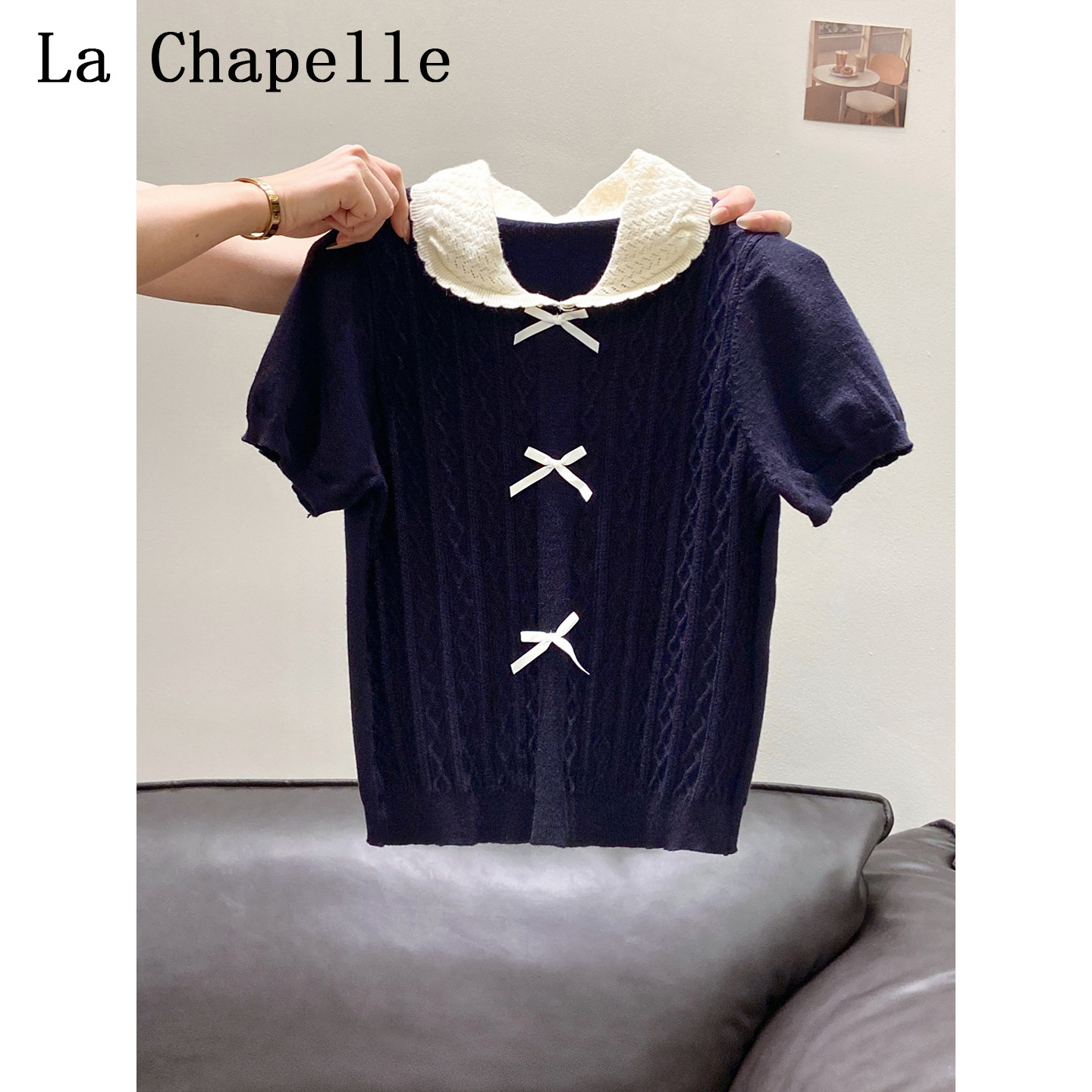 拉夏贝尔法式甜美娃娃领蝴蝶结撞色短袖针织衫女2026新款修身上衣