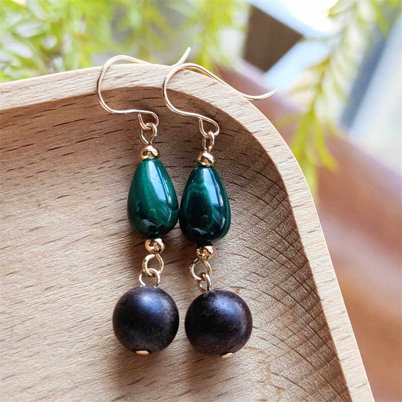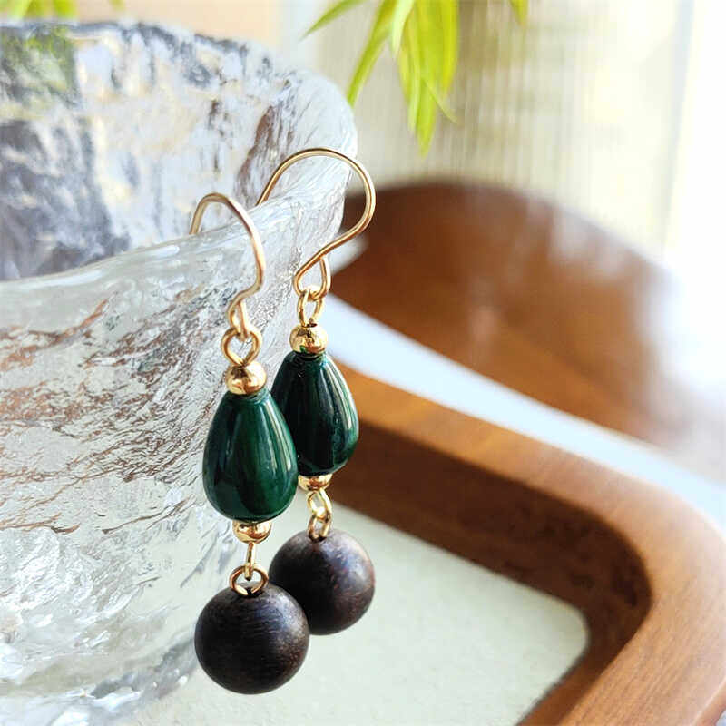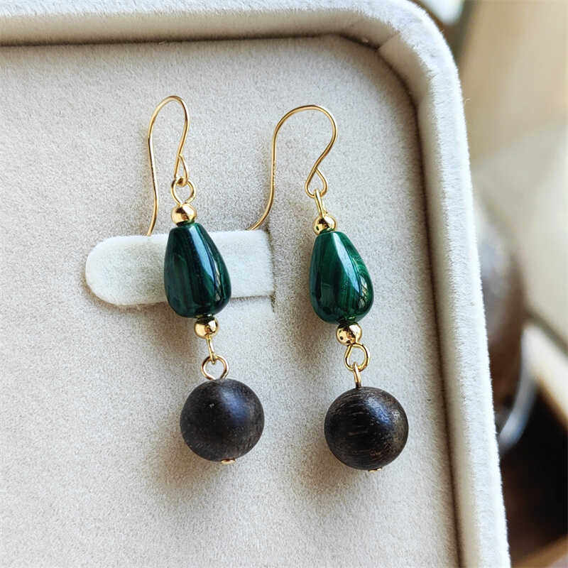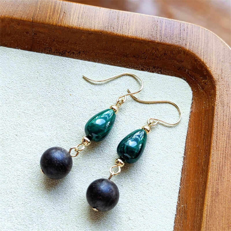 越南芽庄白琪楠沉香耳饰天然孔雀石耳环复古气质小众高级檀木耳饰