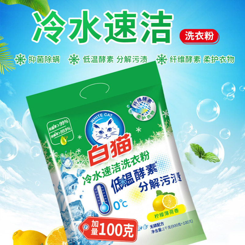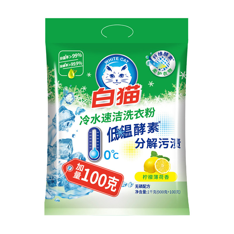 白猫冷水速洁洗衣粉柠檬薄荷香双重酵素去渍抑菌除螨洗衣粉家庭装