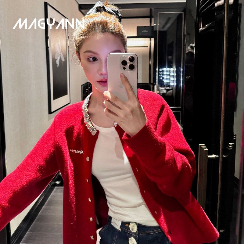 【烟火】Magyann设计师原创2026春安可拉红圆领亮片领口针织开衫