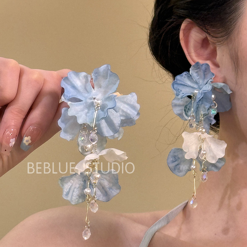 玫瑰冰茶_蓝色流苏花朵耳钉高级度假风夏天爆款小众耳环绝美耳饰
