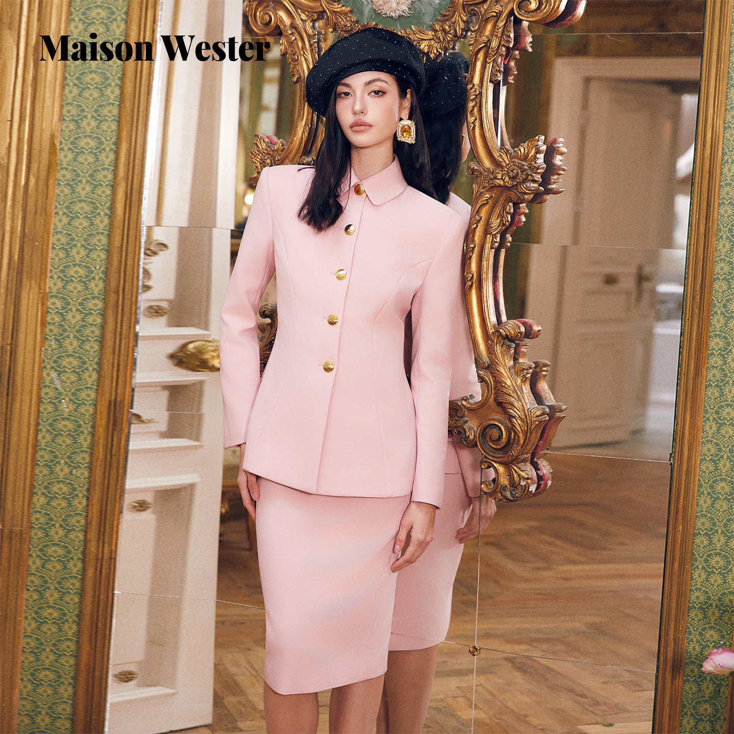 【章若楠同款】Maison Wester2026春新品粉调金扣收腰翻领外套