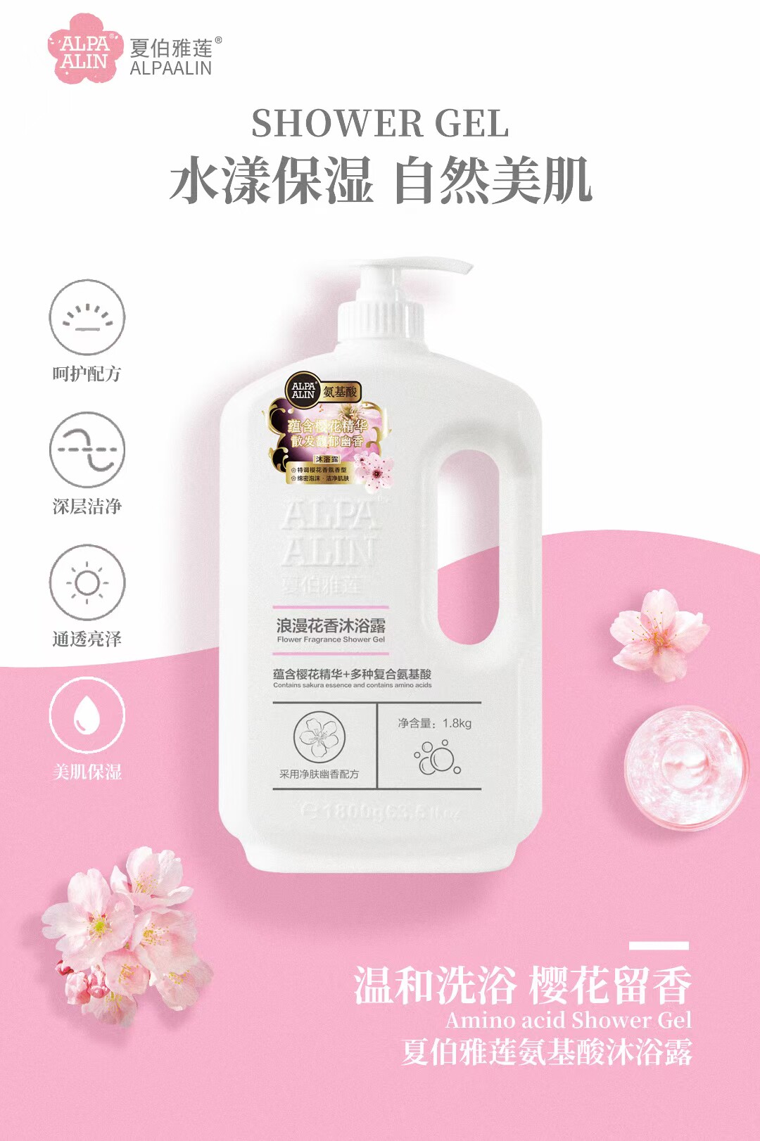 夏伯雅莲氨基酸香氛沐浴露1.8kg大容量家庭装白茶樱花精华清香