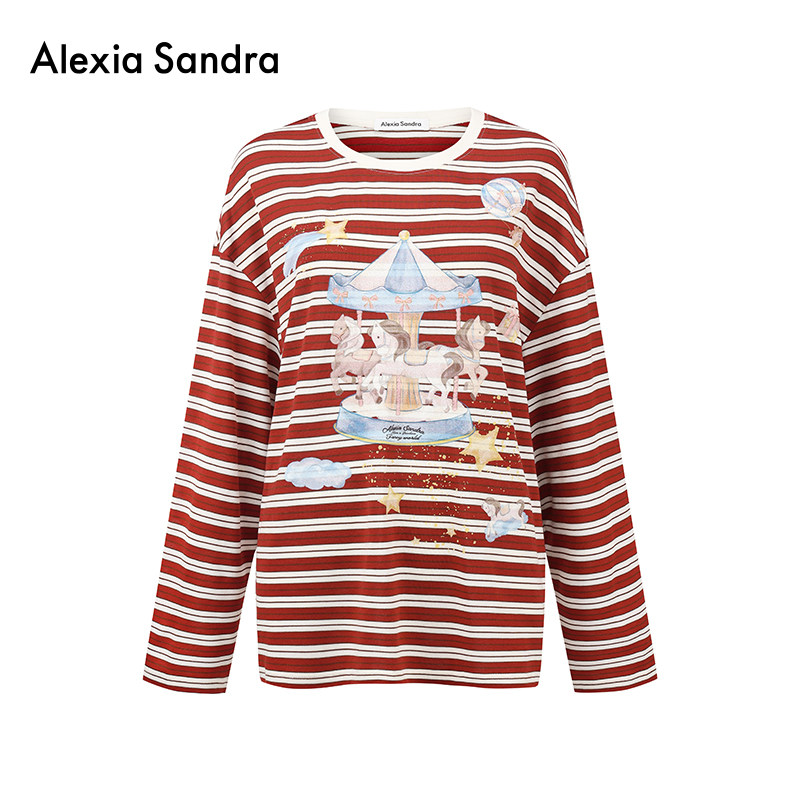 徐艺洋同款AlexiaSandra2026春季新款羊毛经典条纹印花长袖T恤