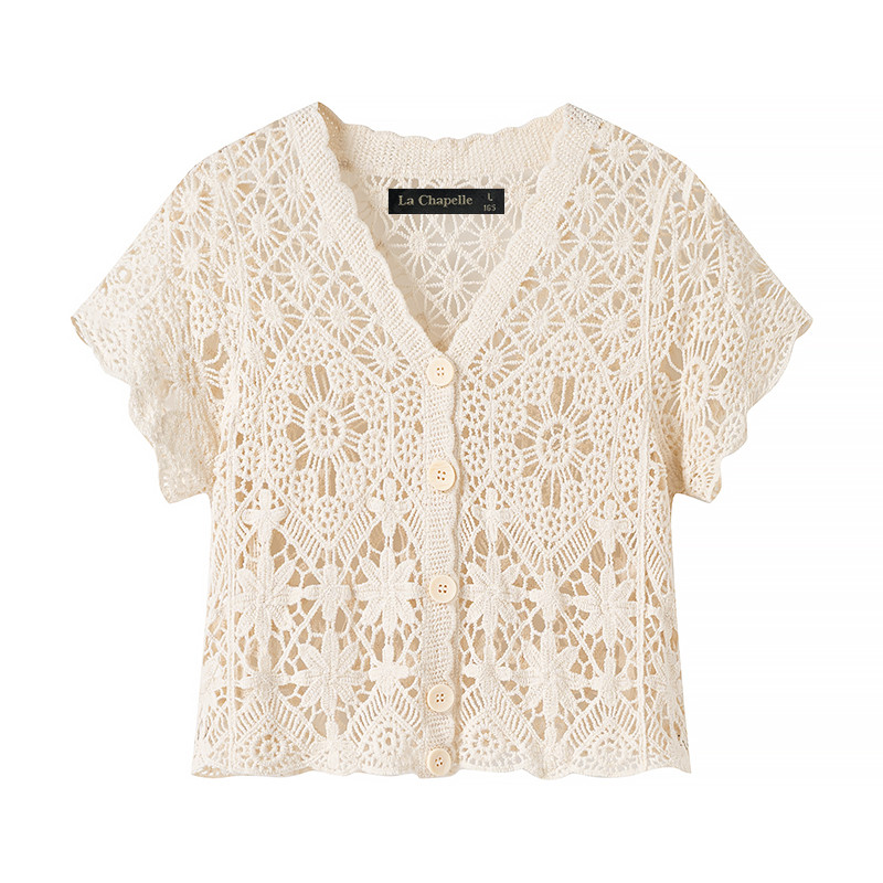 拉夏贝尔/La Chapelle洋气蕾丝镂短袖开衫女夏季新款V领小衫上衣