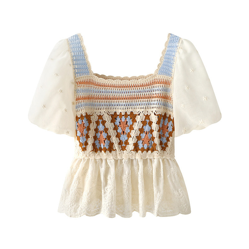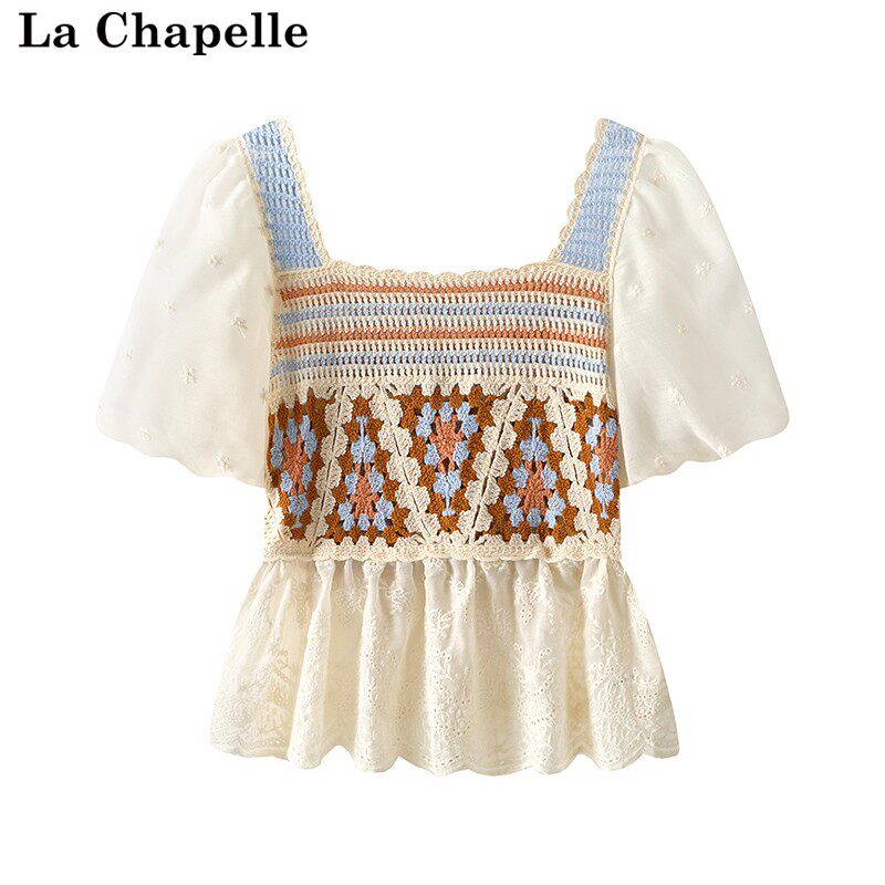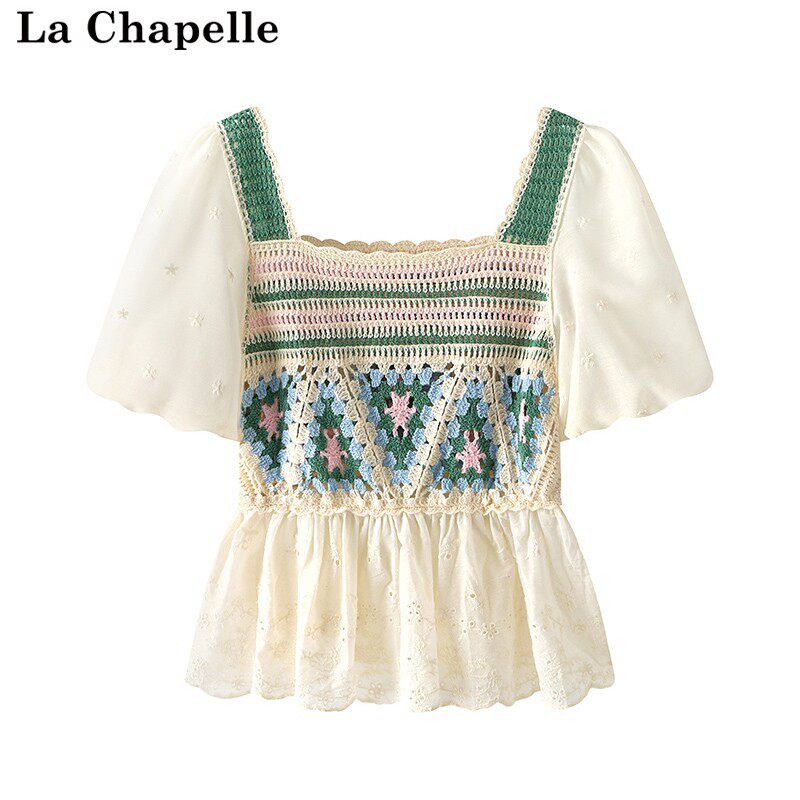 拉夏贝尔/La Chapelle方领短袖衬衫女夏小个子拼接短款娃娃衫上衣