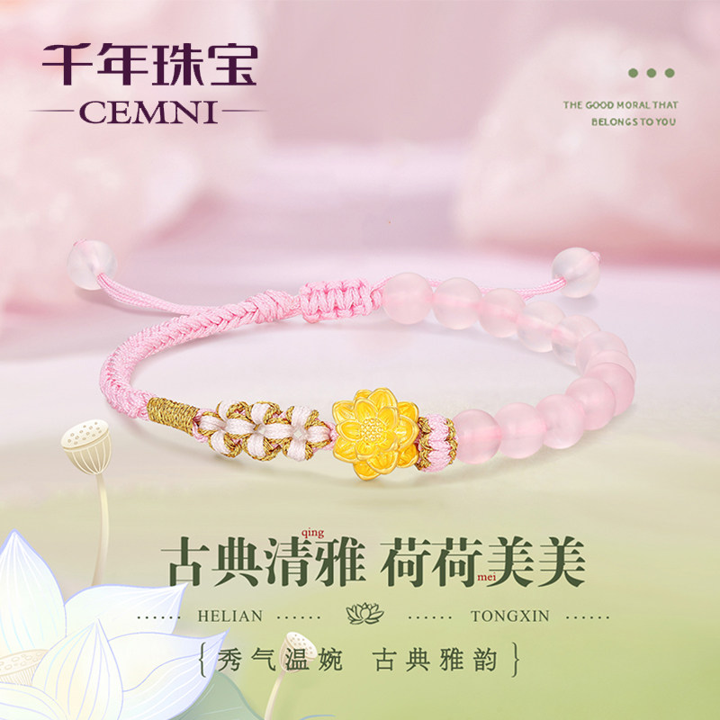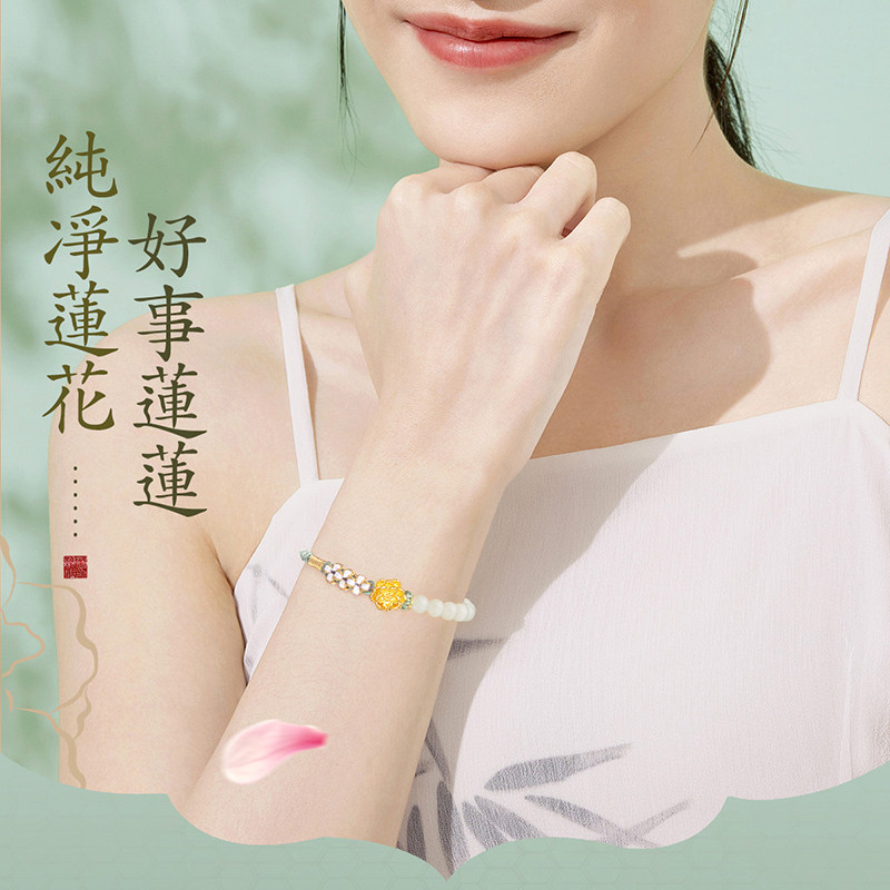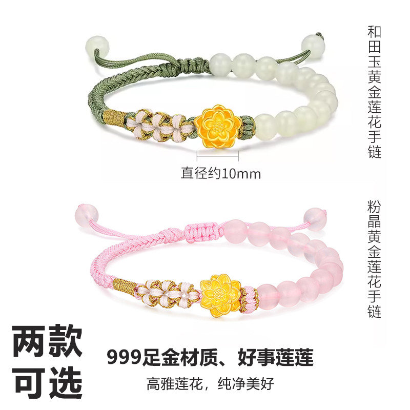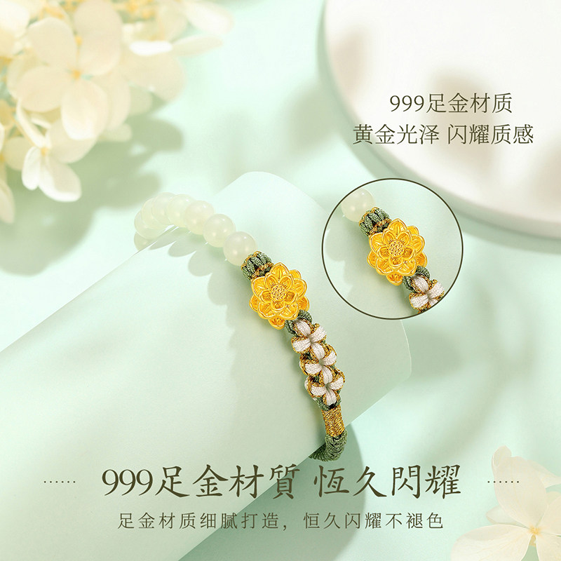 千年珠宝黄金手链女足金999莲花手绳和田玉转运珠黄金手串新款