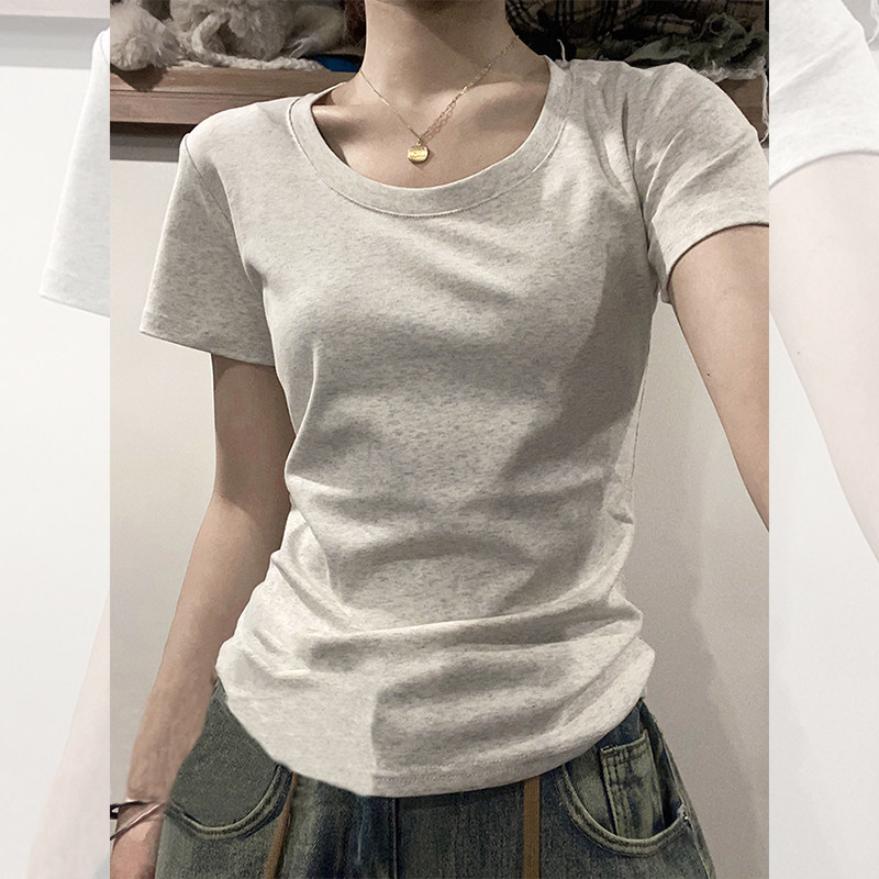 拉夏贝尔纯棉V领正肩女t恤短袖夏2026新款基础款修身灰色打底上衣