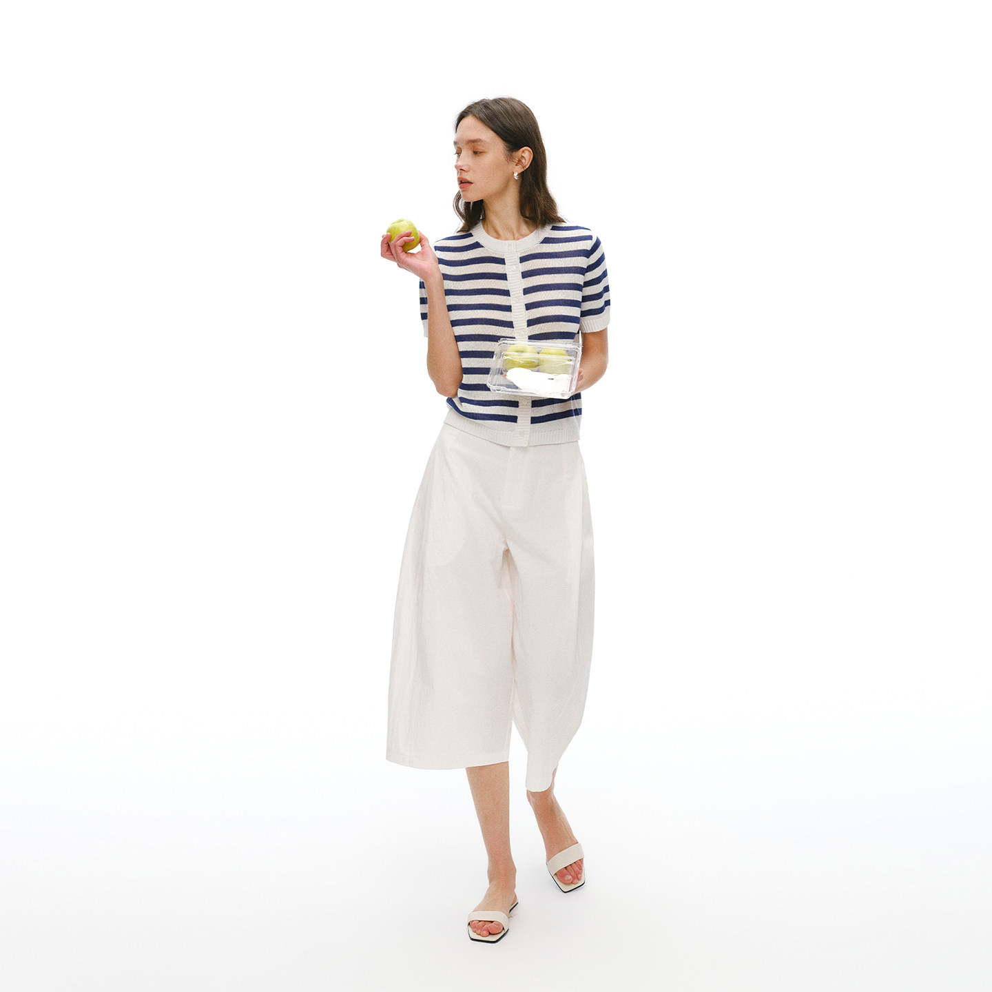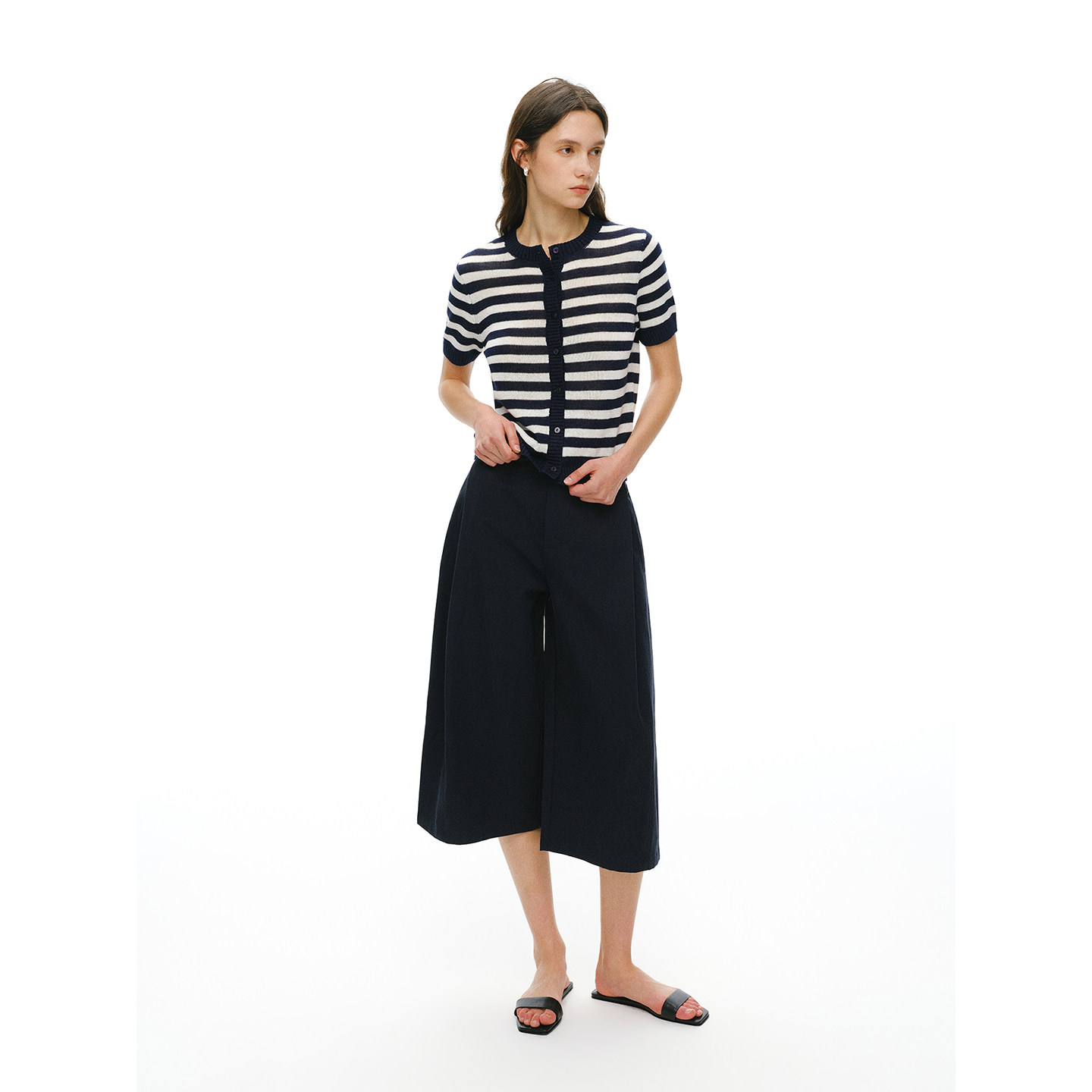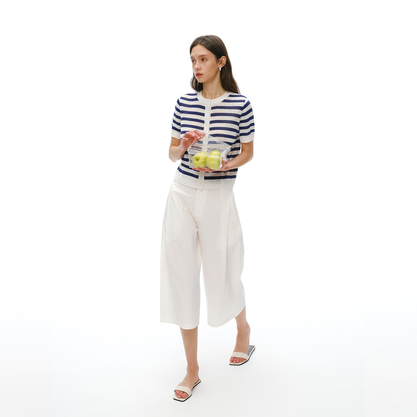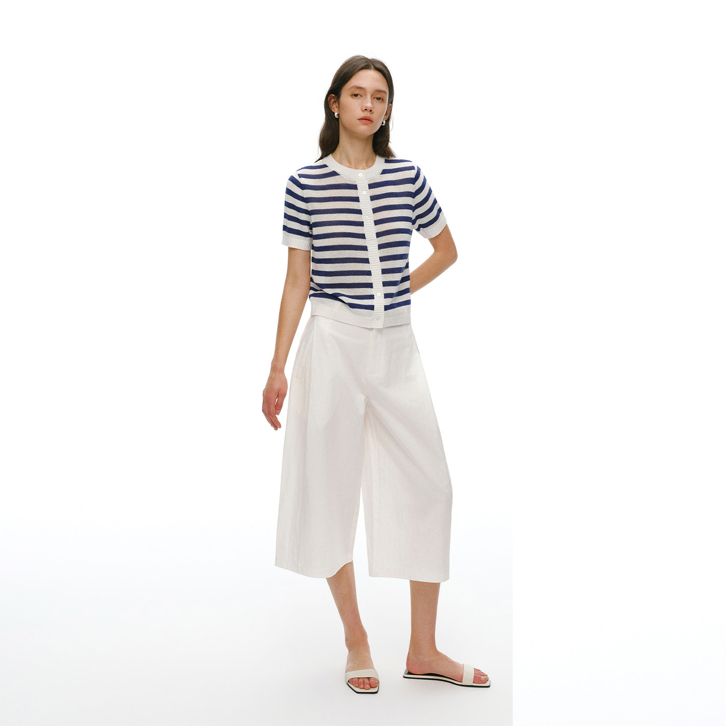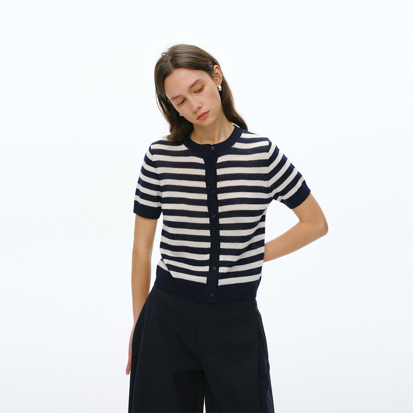 NANCYLILI26春季新品航海风条纹短袖针织开衫女正肩显瘦短款上衣