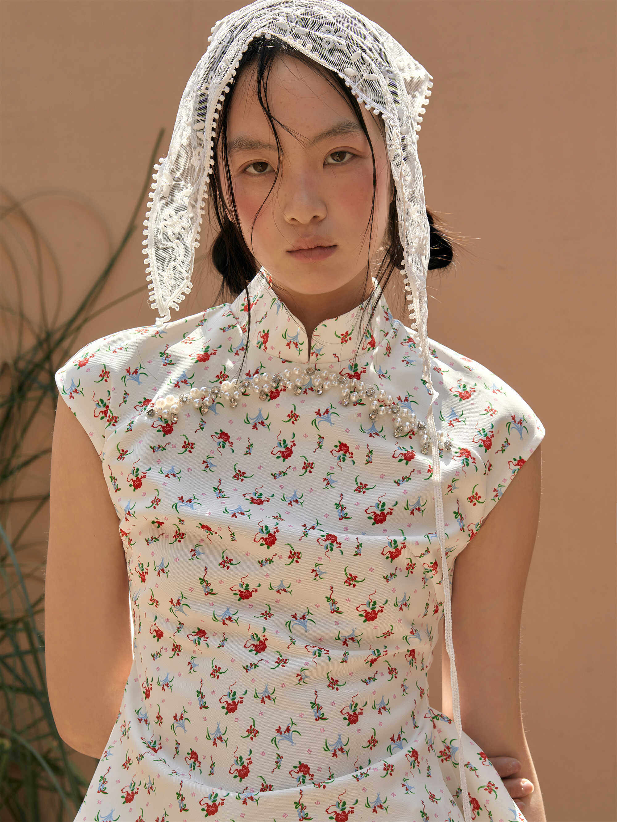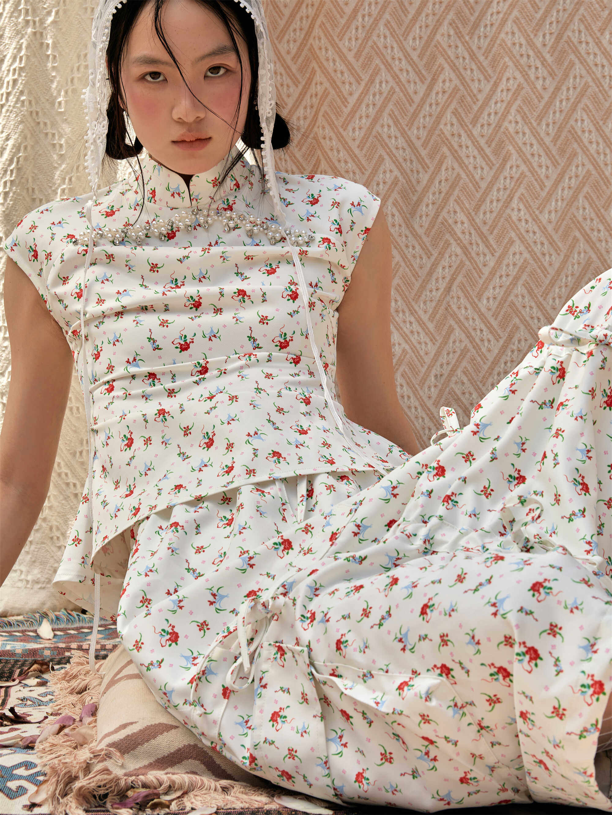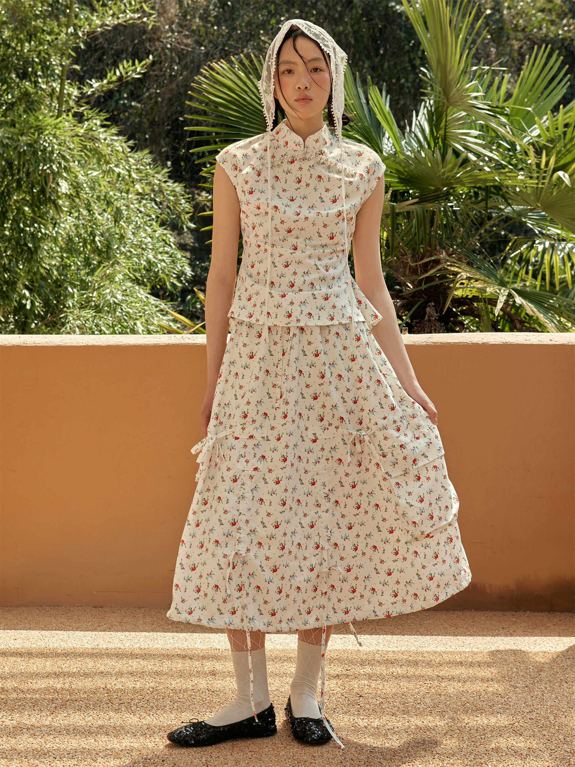Shiitake 花卉画卷清甜碎花旗袍立领串珠无袖收腰抽褶新中式上衣