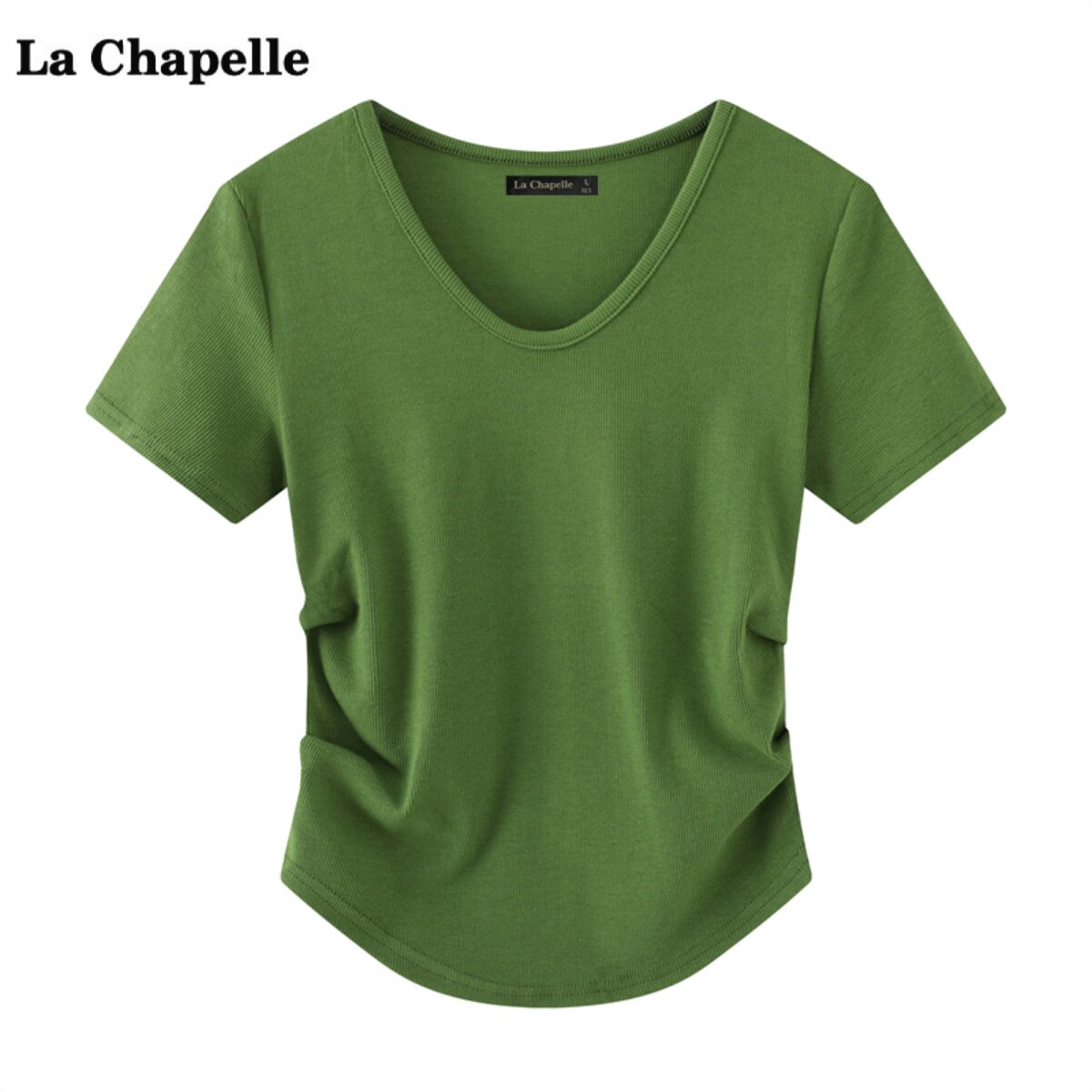 拉夏贝尔/La Chapelle纯色V领短袖T恤女夏季新款褶皱修身显瘦上衣
