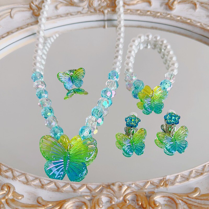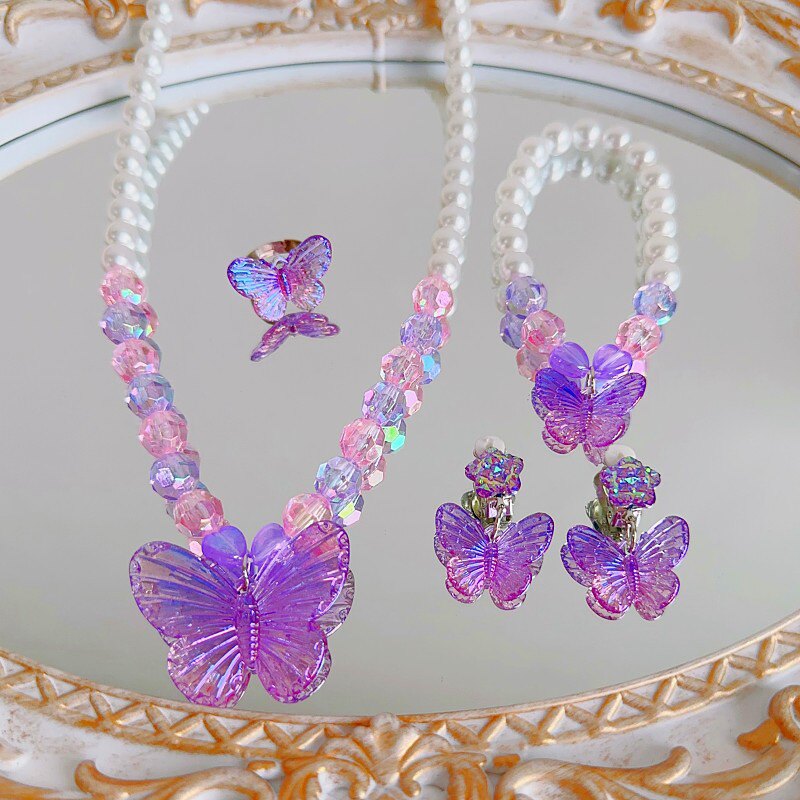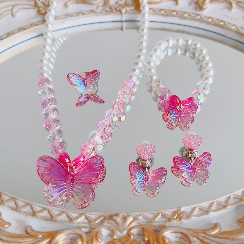 新品儿童项链耳环戒指可爱卡通蝴蝶女童项饰公主宝宝首饰套装