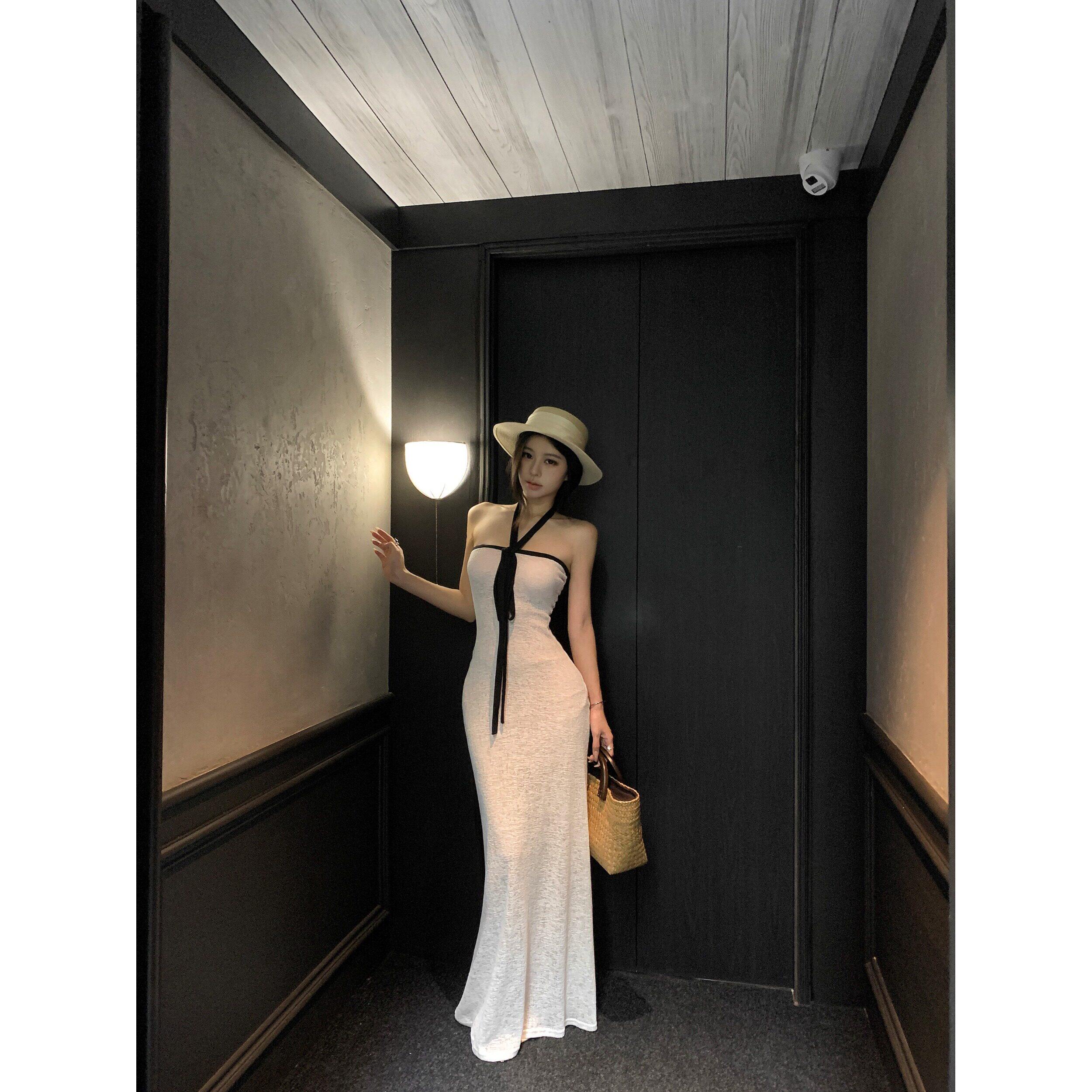 辣妹风白色挂颈抹胸洋装女夏季修身收腰无袖裙子凸显身材包臀长裙