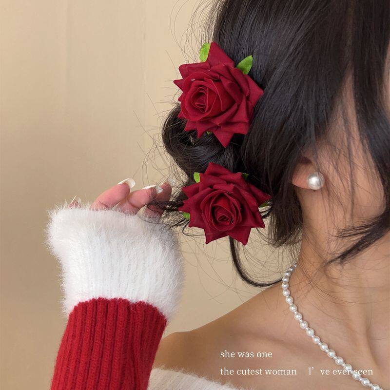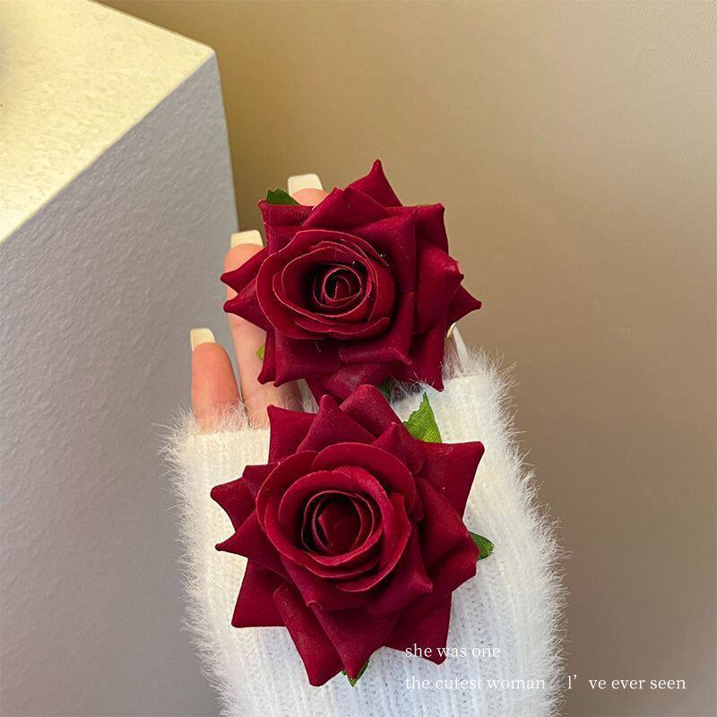 红色玫瑰花头饰发夹轻奢复古头花纯欲感森女拍照仿真花朵鸭嘴夹子
