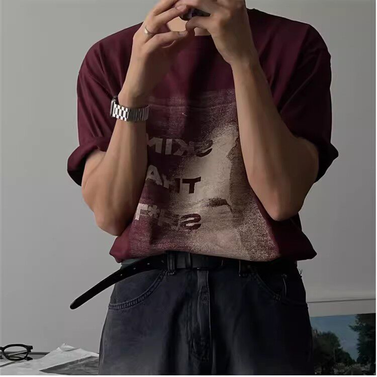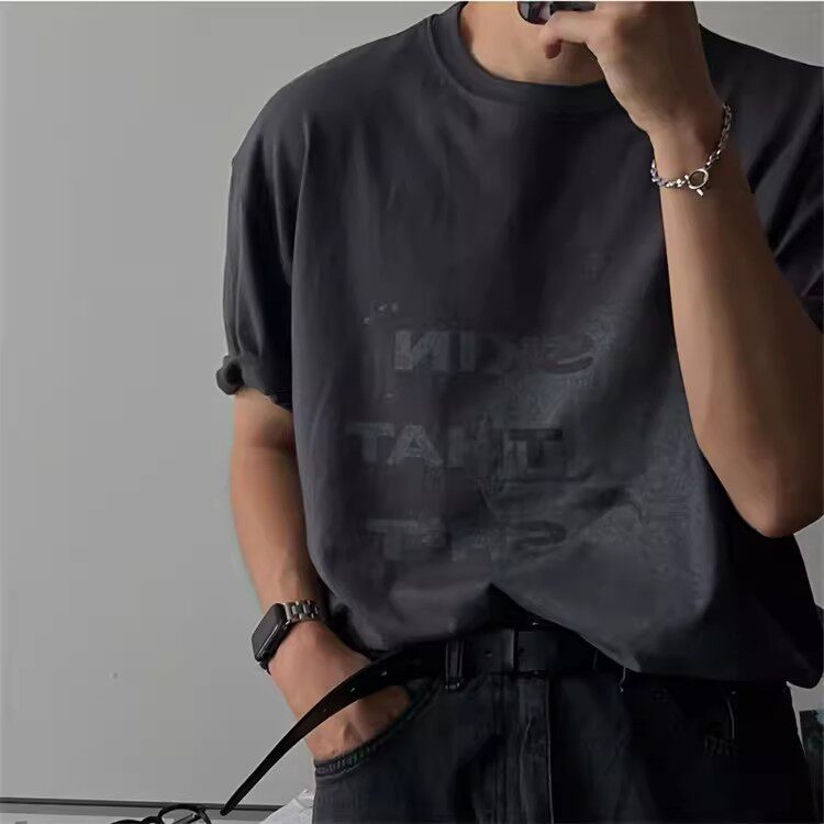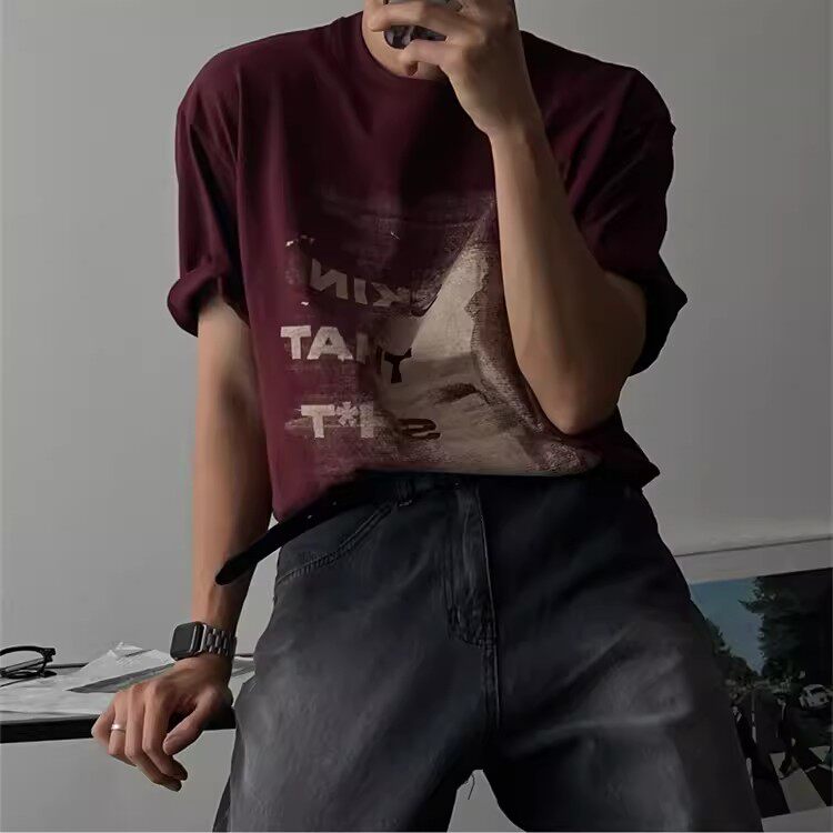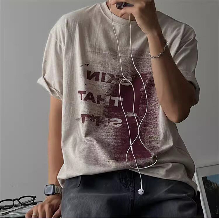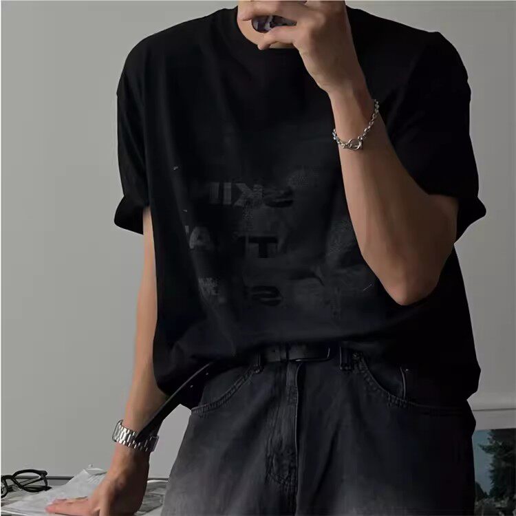 韩国代购男装高街潮流个性艺术感抽象晕染字母宽松休闲短袖T恤衫