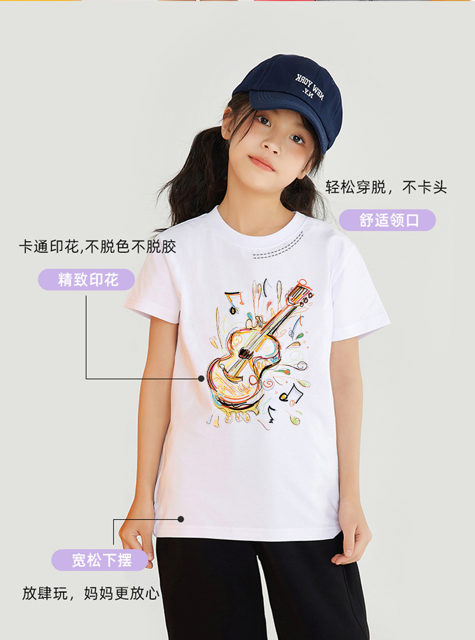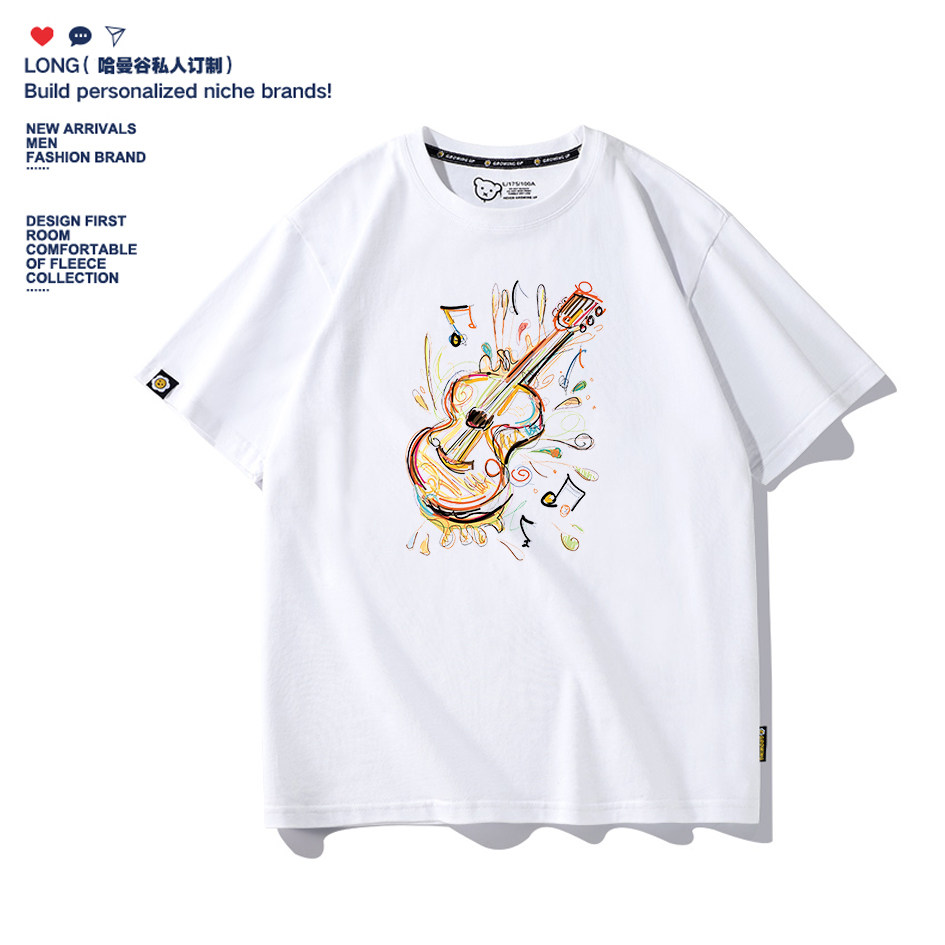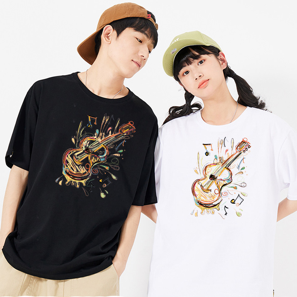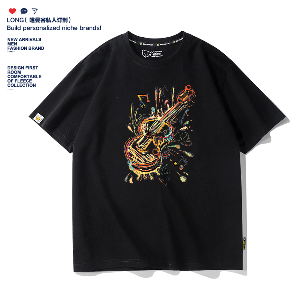 彩色吉他短袖百搭休闲嘻哈风原创印花圆领设计感潮流男女创意T恤