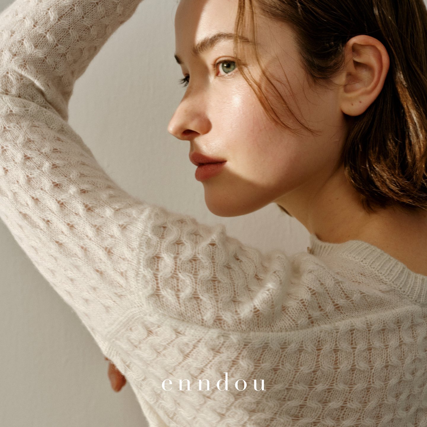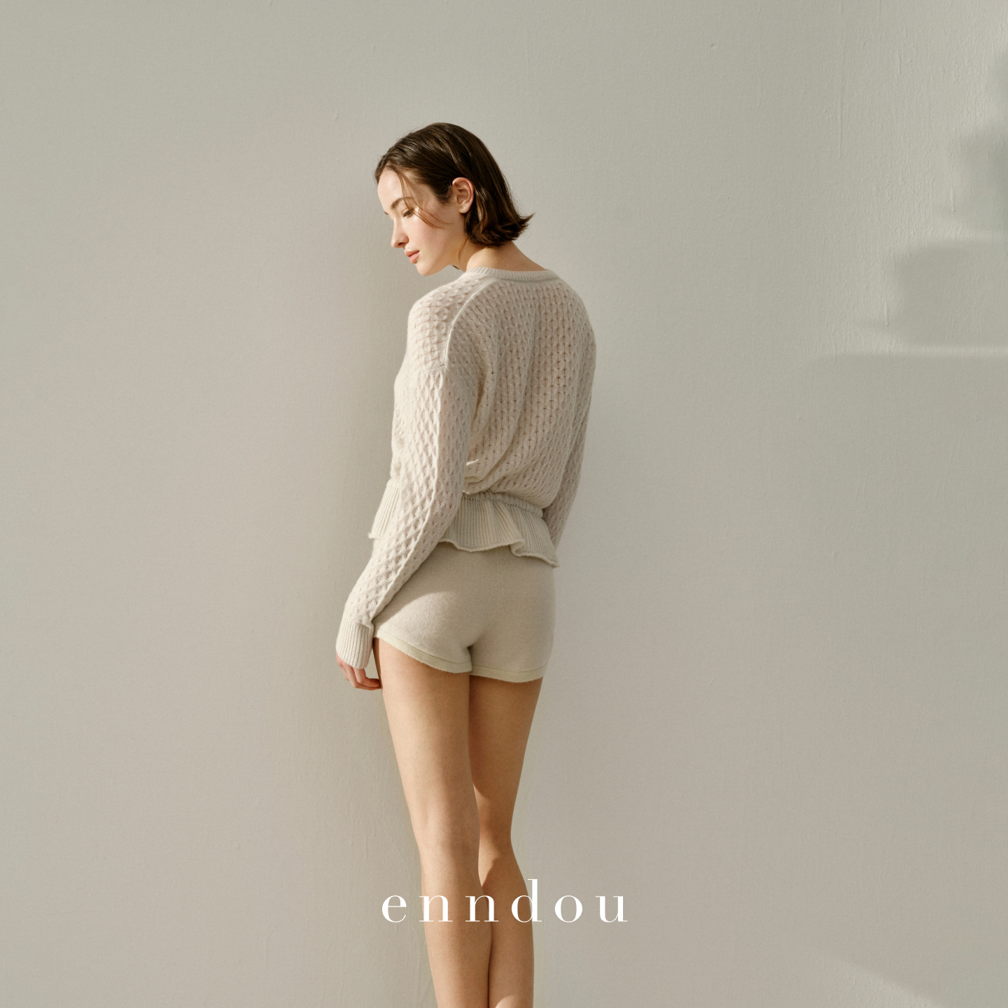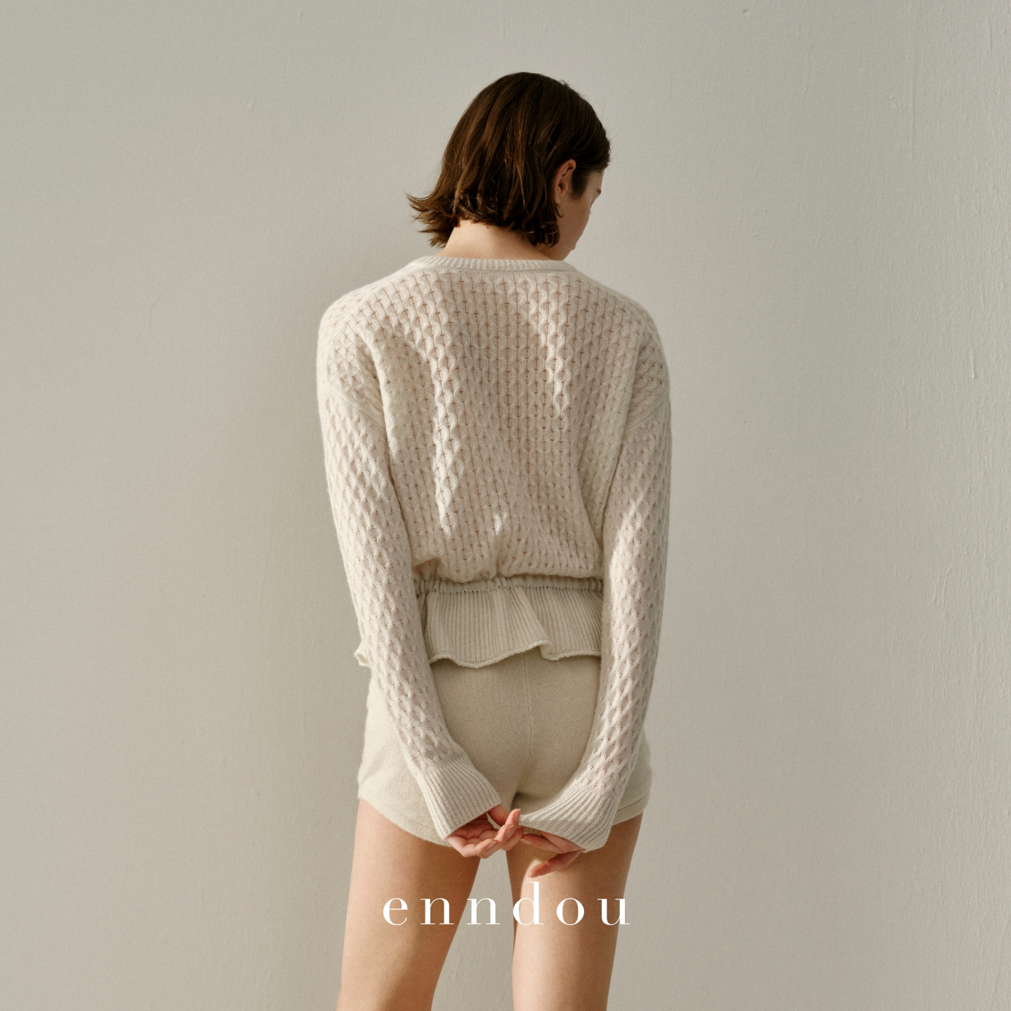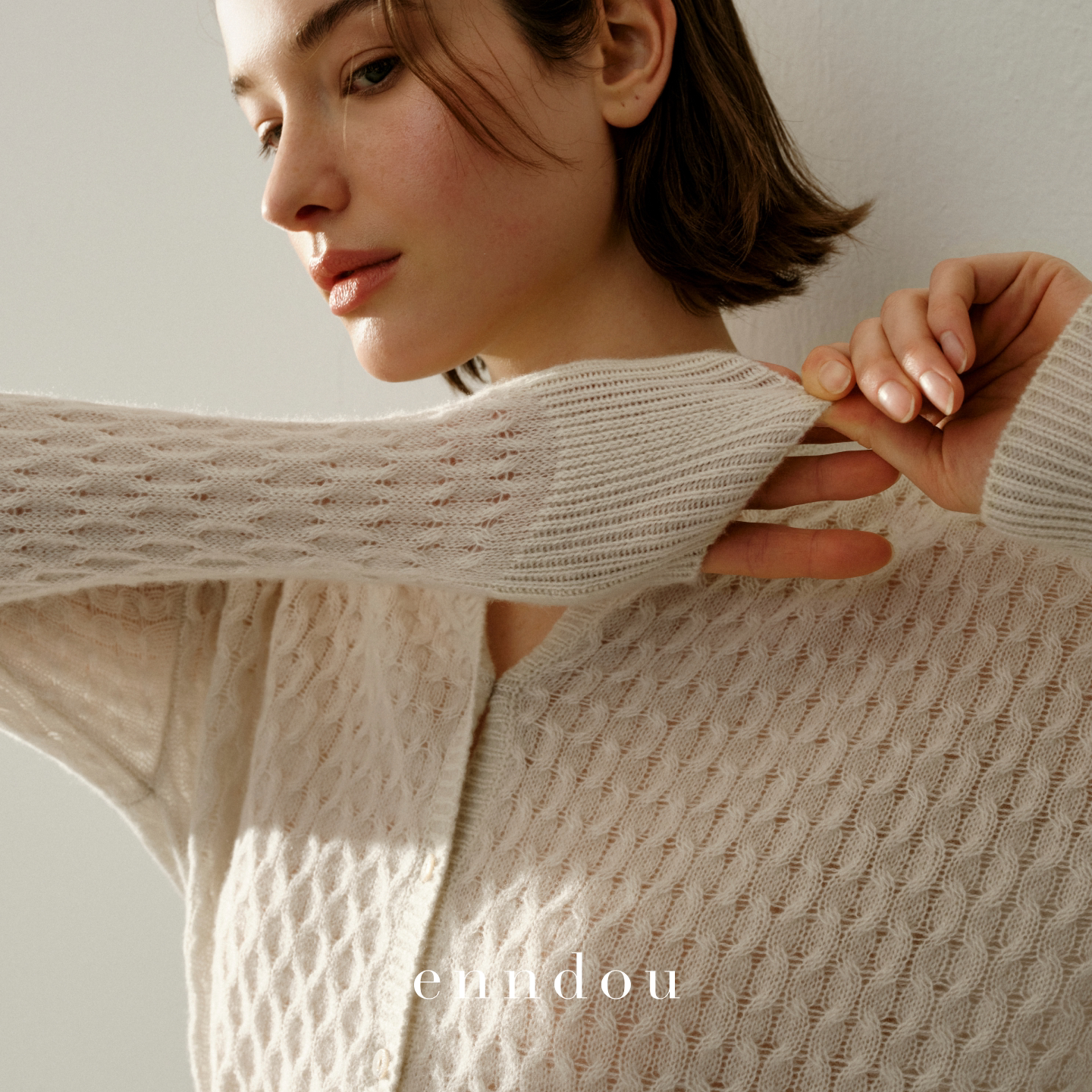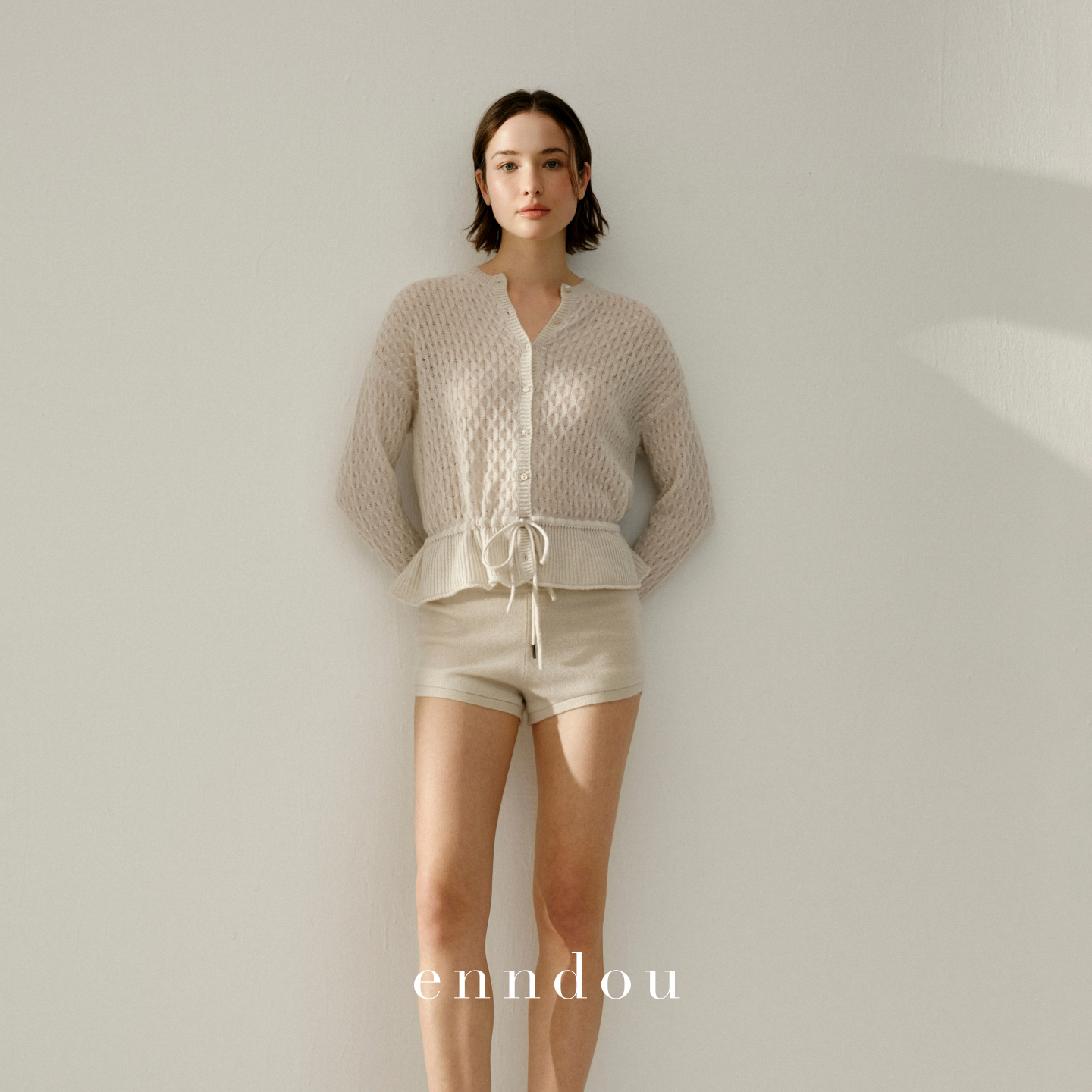 enndou2026春装新款100%纯山羊绒系带收腰针织开衫镂空网格羊绒衫
