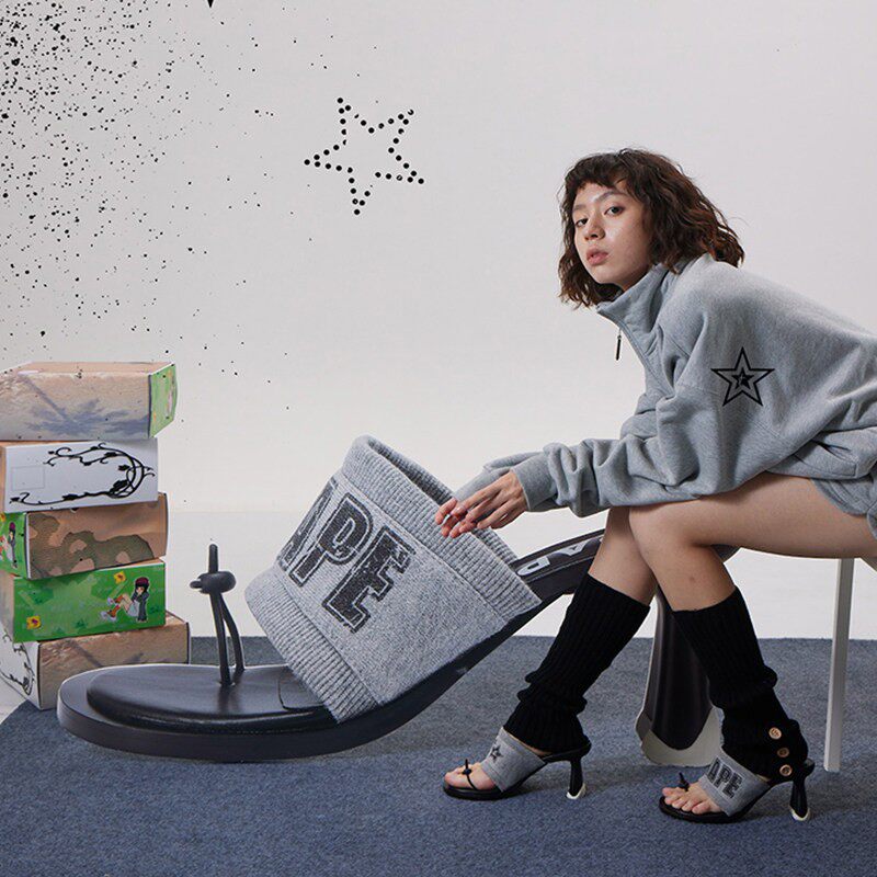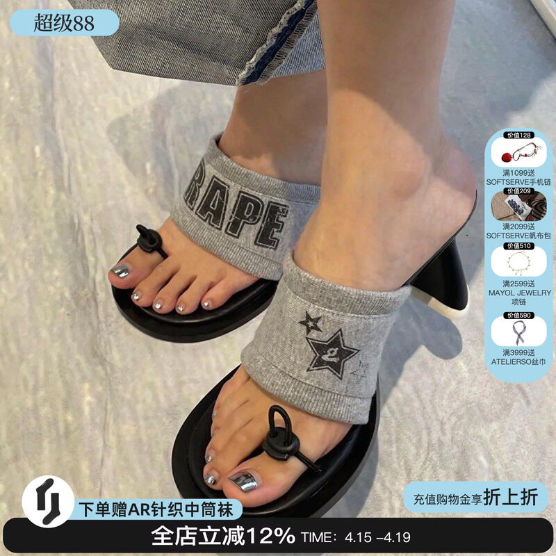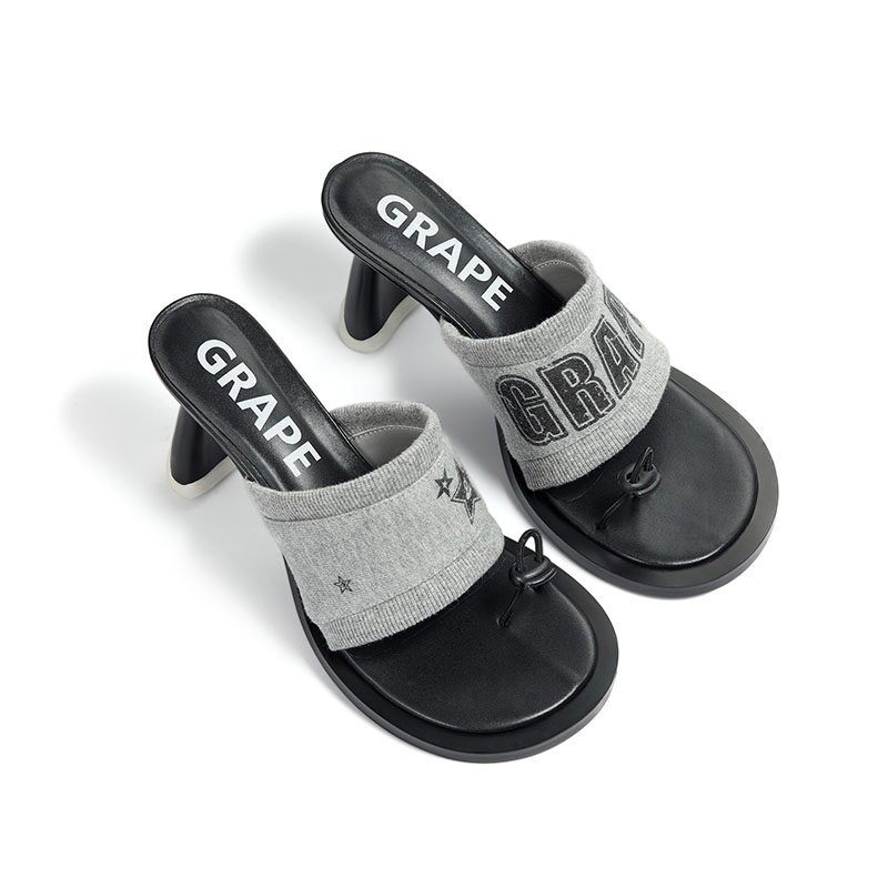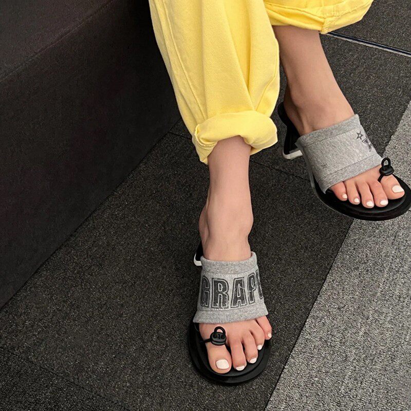 GRAPE 26新款灰色涂鸦印花高跟凉拖鞋露趾增高外穿人字拖凉鞋百搭