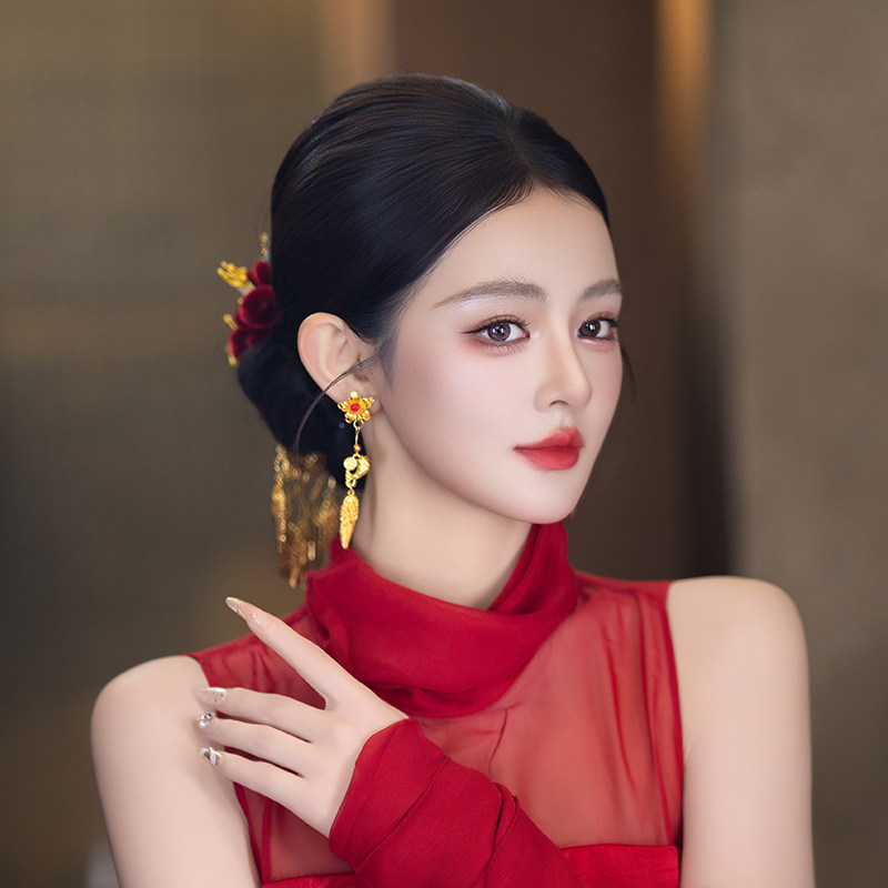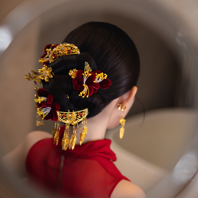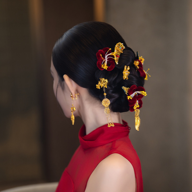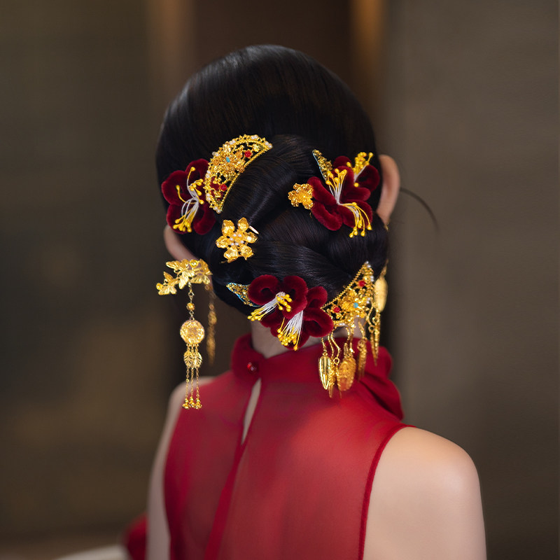 国风新娘贵气头饰手工复古红色绒花华丽金色后区礼服旗袍订婚发饰