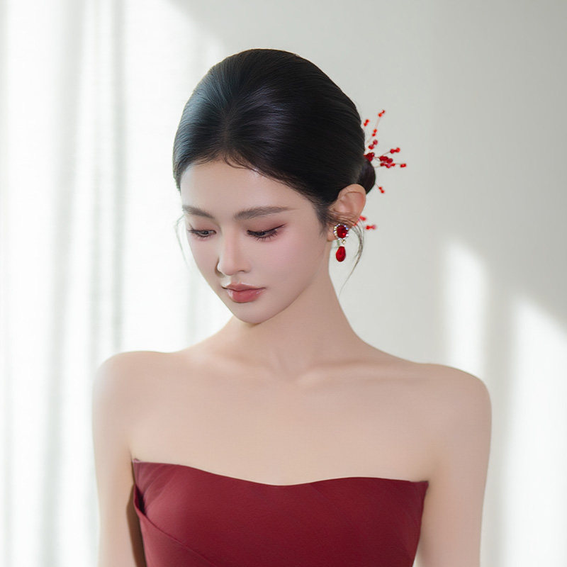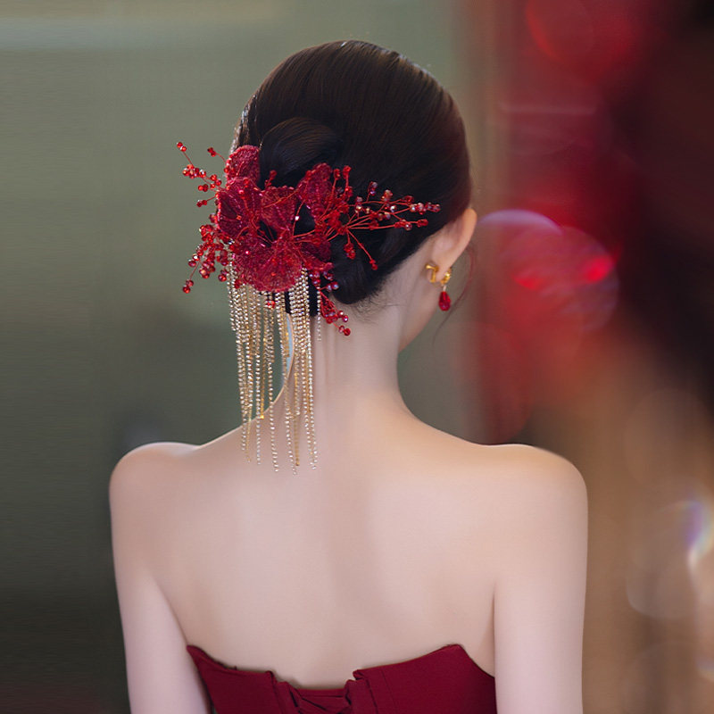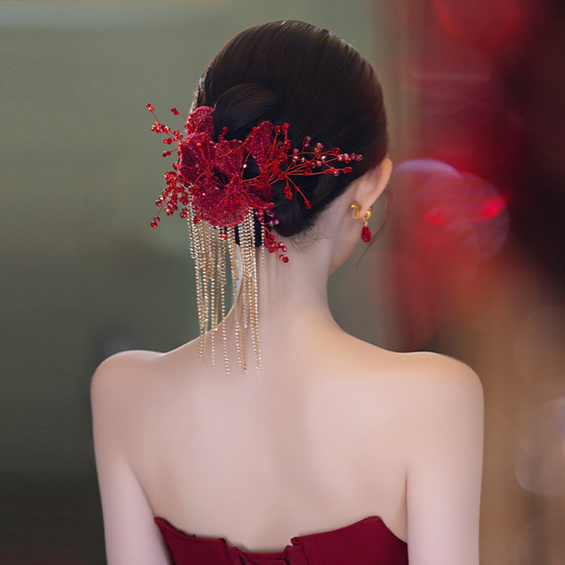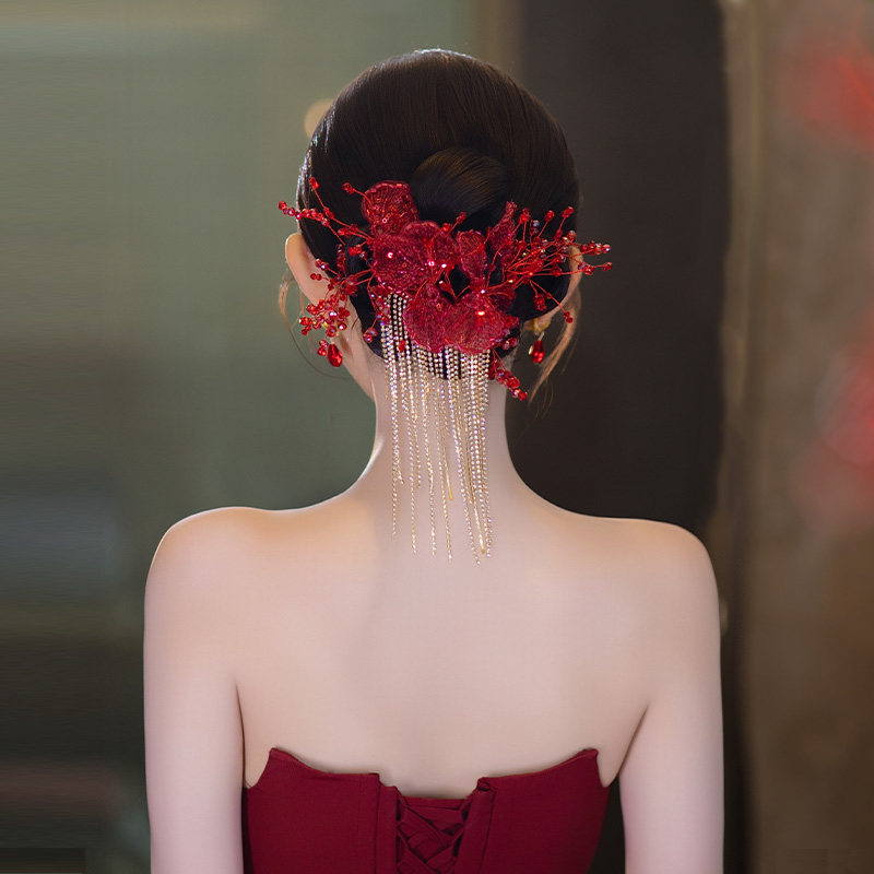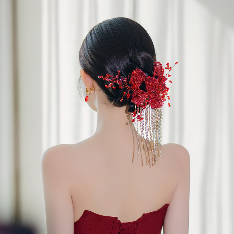 新娘头饰韩式简约高级感红色礼服敬酒服后区流苏盘发气质造型配饰
