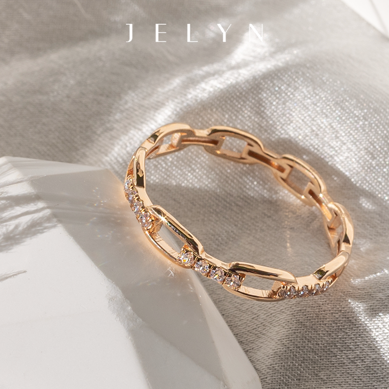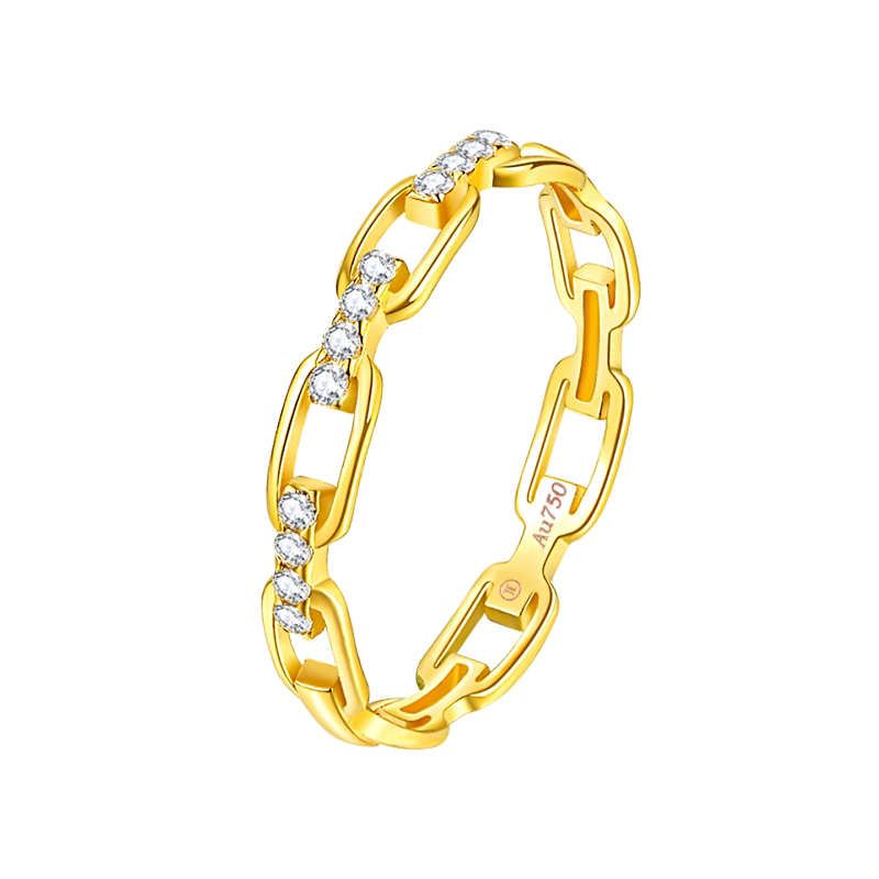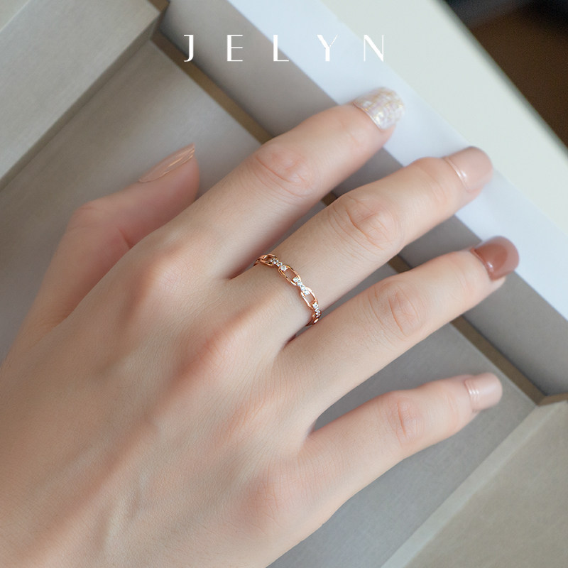 时髦个性链条戒指玥景18K玫瑰金750黄彩金女士镶锆石锁链尾戒指环