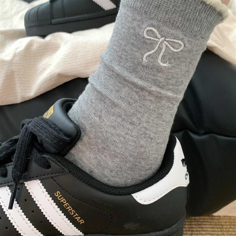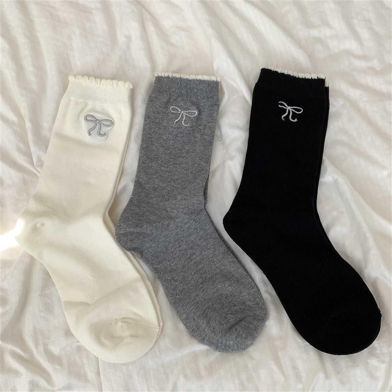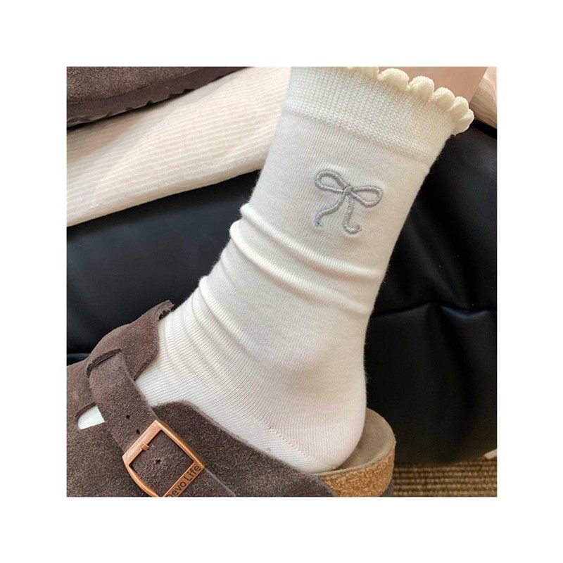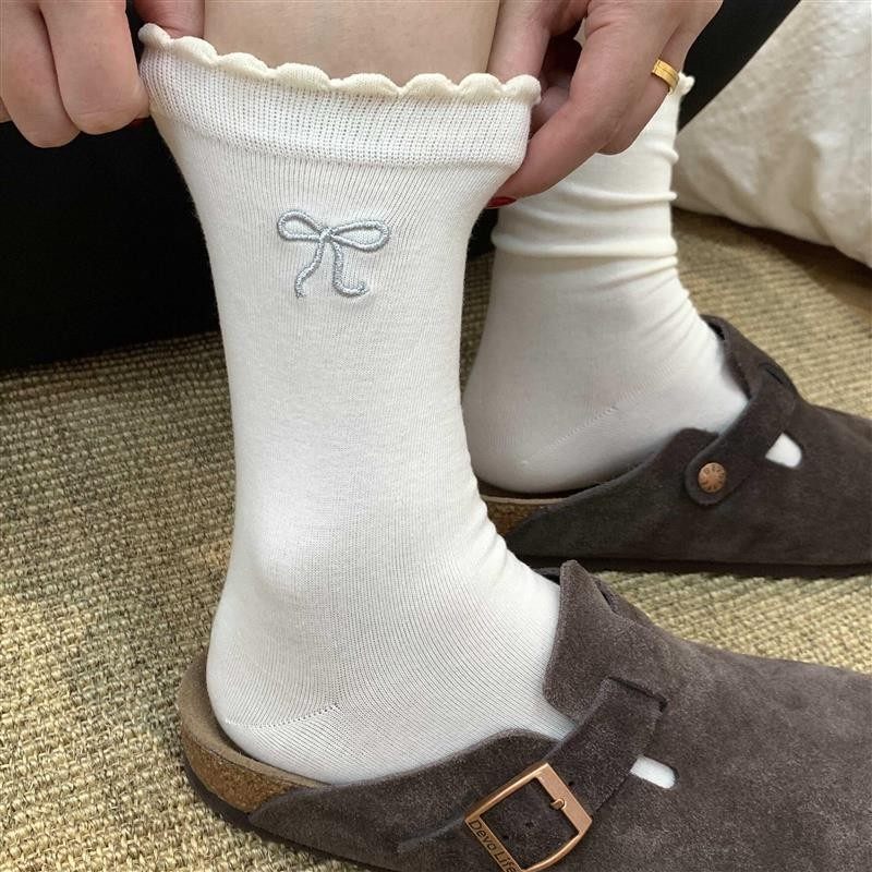 miu白色花边蝴蝶结袜子女春秋纯色中筒袜韩系少女显瘦ins潮堆堆袜