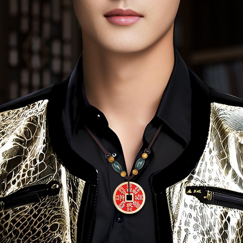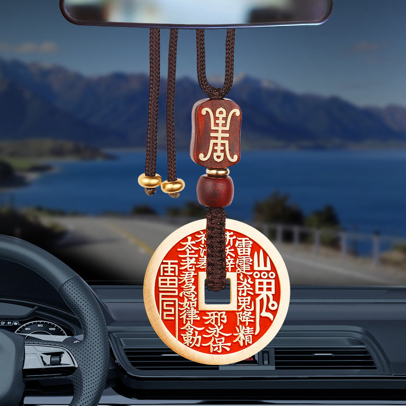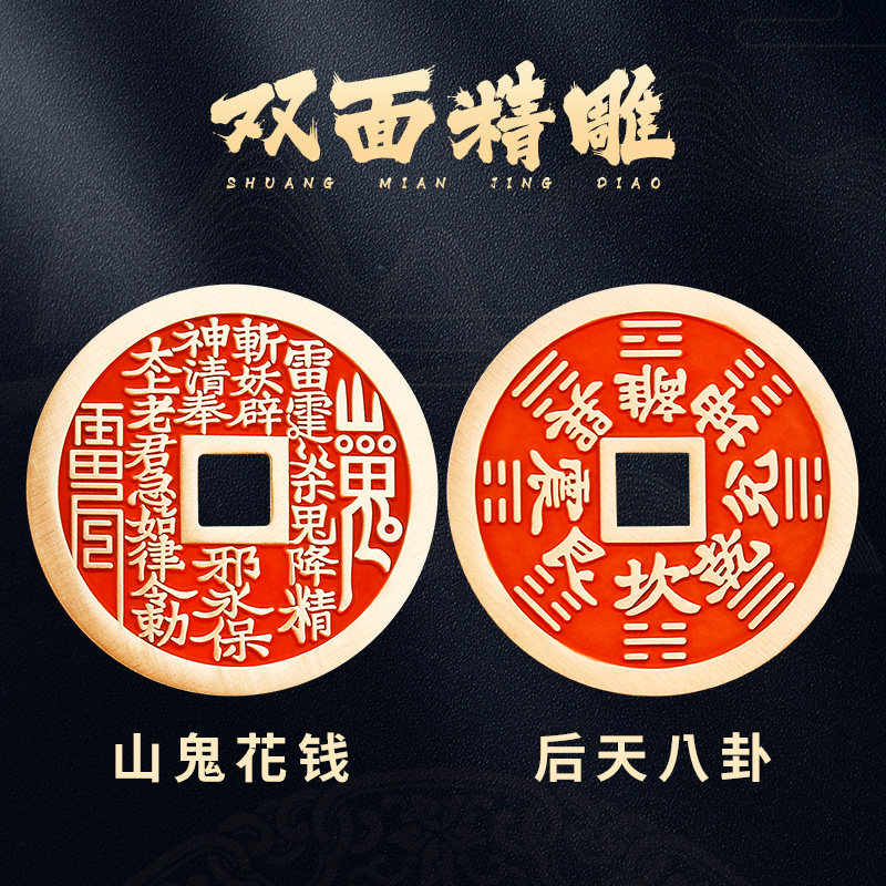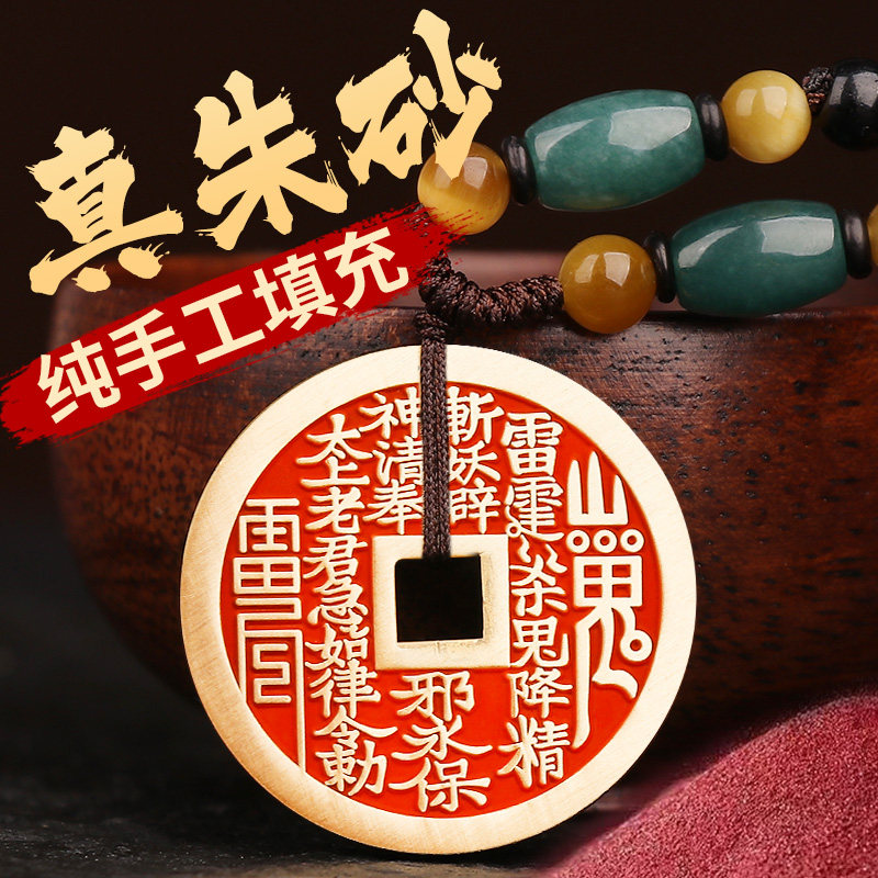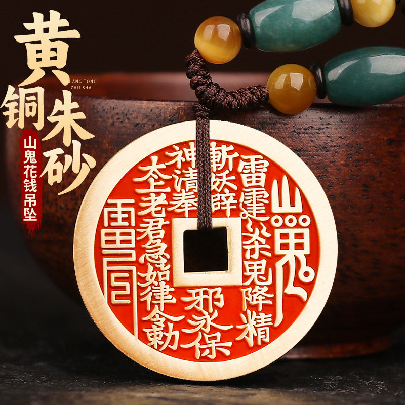 道家朱砂山鬼花钱吊坠纯铜钱真品车钥匙八卦挂件平安本命年项链男