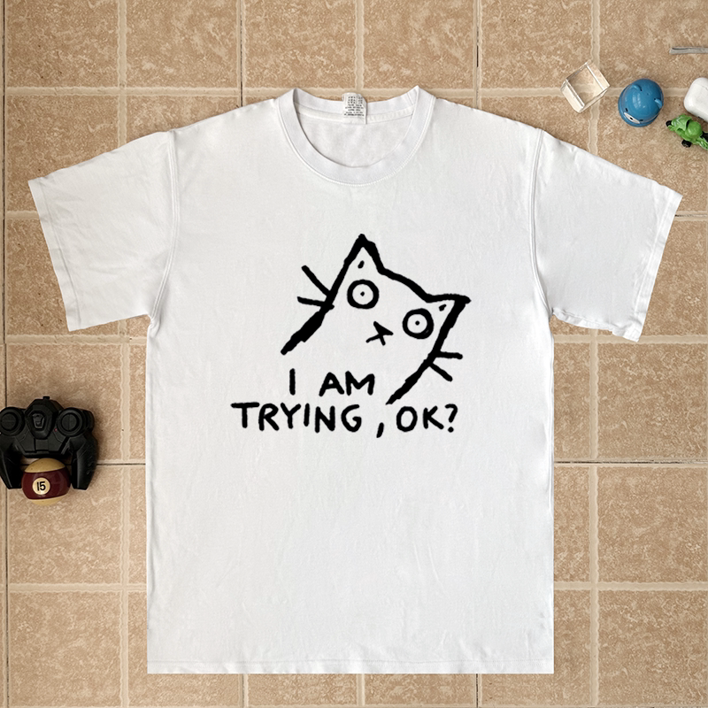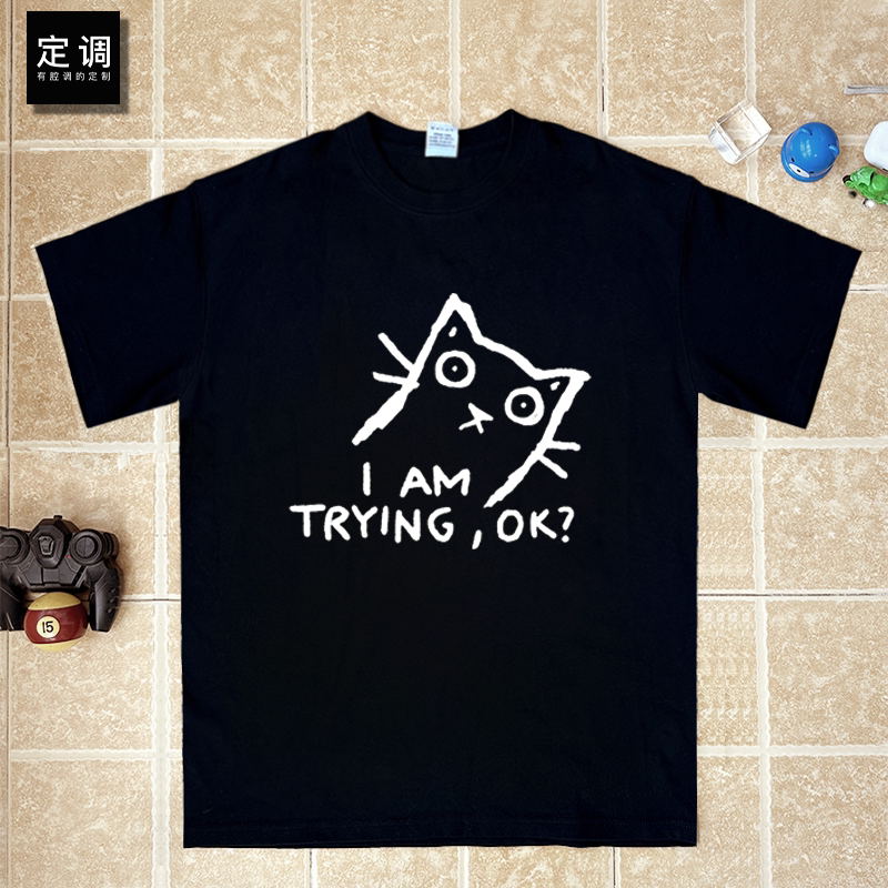 I am trying ok 反催促反上级反领导猫咪印花衣服短袖t恤全棉衣服