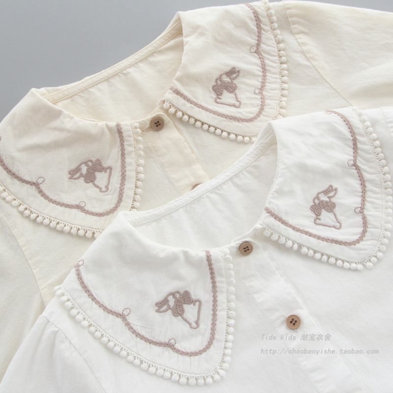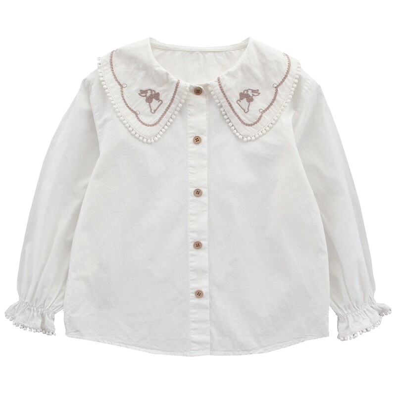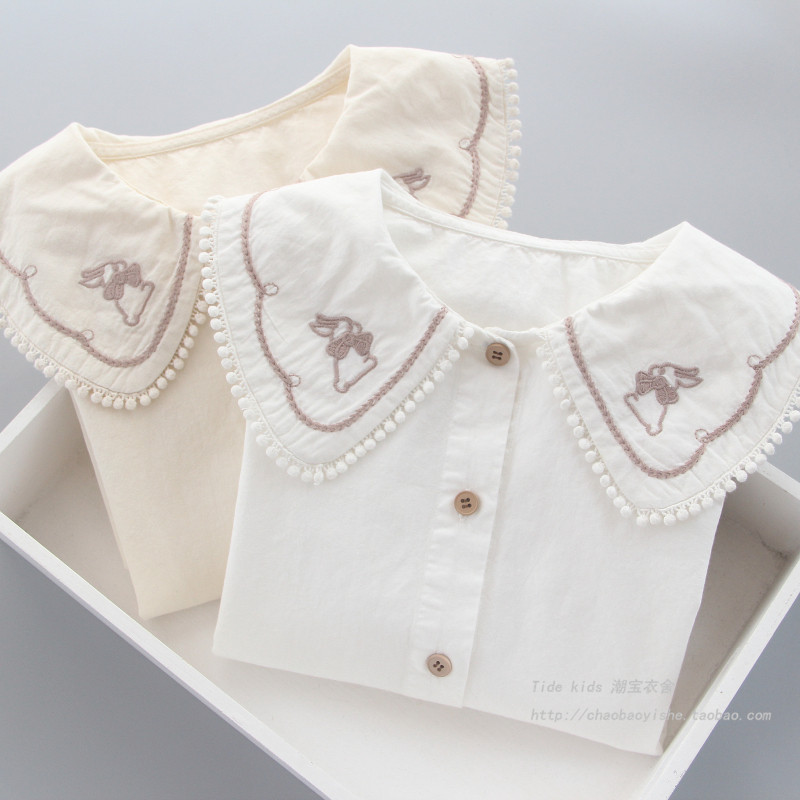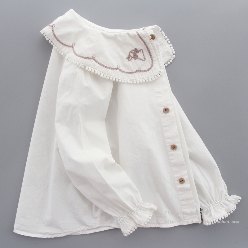 女童衬衫白色春秋装新款韩版儿童娃娃领刺绣长袖衬衣女孩纯棉上衣
