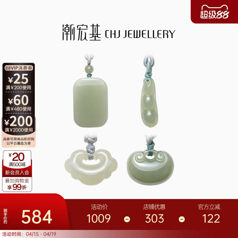 潮宏基倾玉和田玉项链玉石坠链颈饰无事牌中式国风礼物生日妈妈