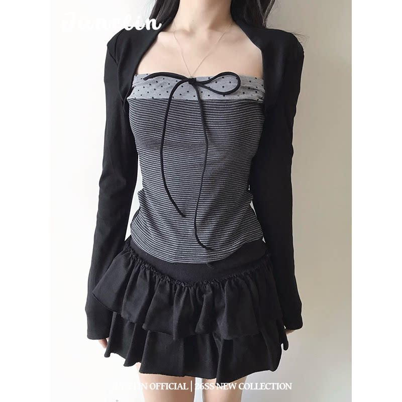 六月林 2026新款韩系时尚洋气甜辣风黑色波点条纹蝴蝶结上衣显白