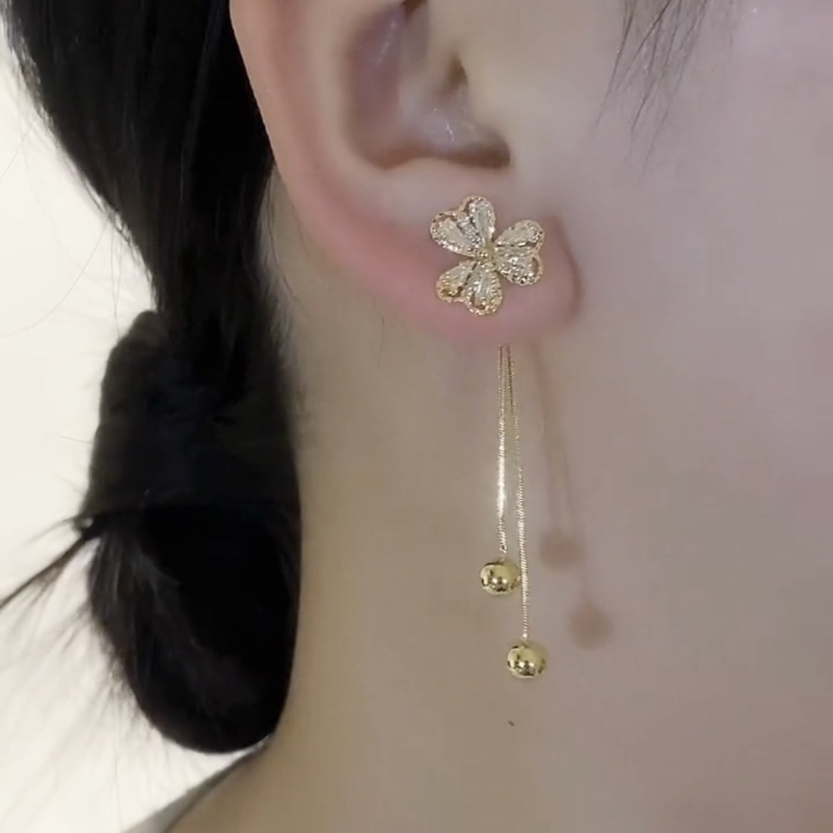 s925银针韩国镶钻三叶花两戴流苏耳环2025年新款网红轻奢耳钉耳饰