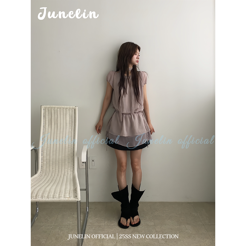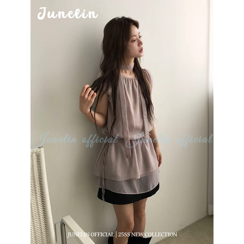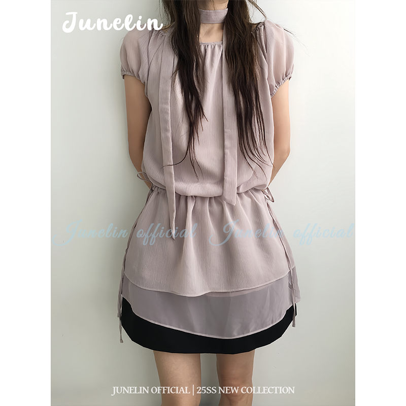 六月林 韩系新款挂脖飘带连衣裙女温柔浅紫短袖雪纺裙