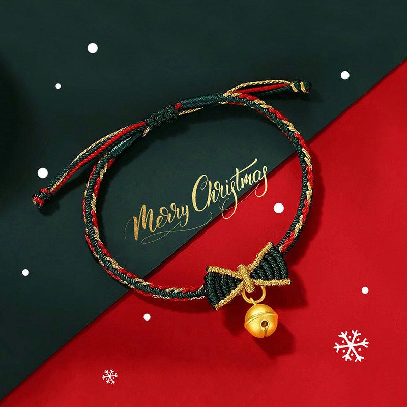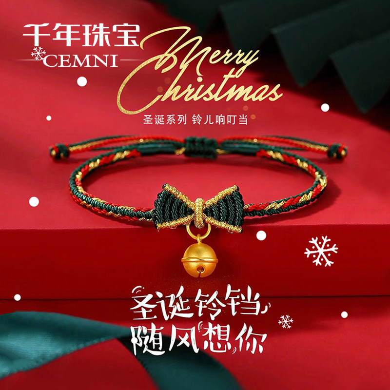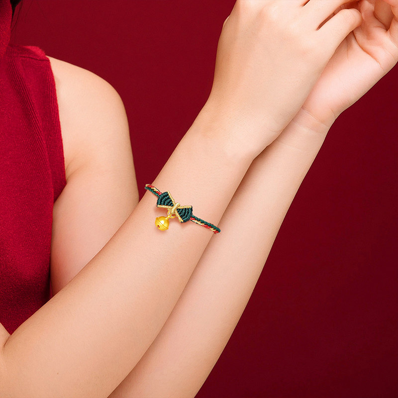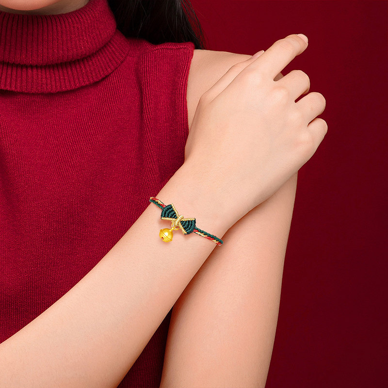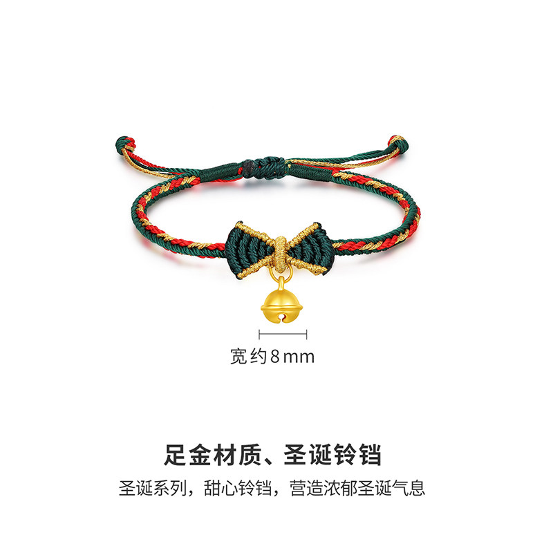 千年珠宝黄金手链女足金999铃铛手绳圣诞礼物蝴蝶结手绳新款送礼