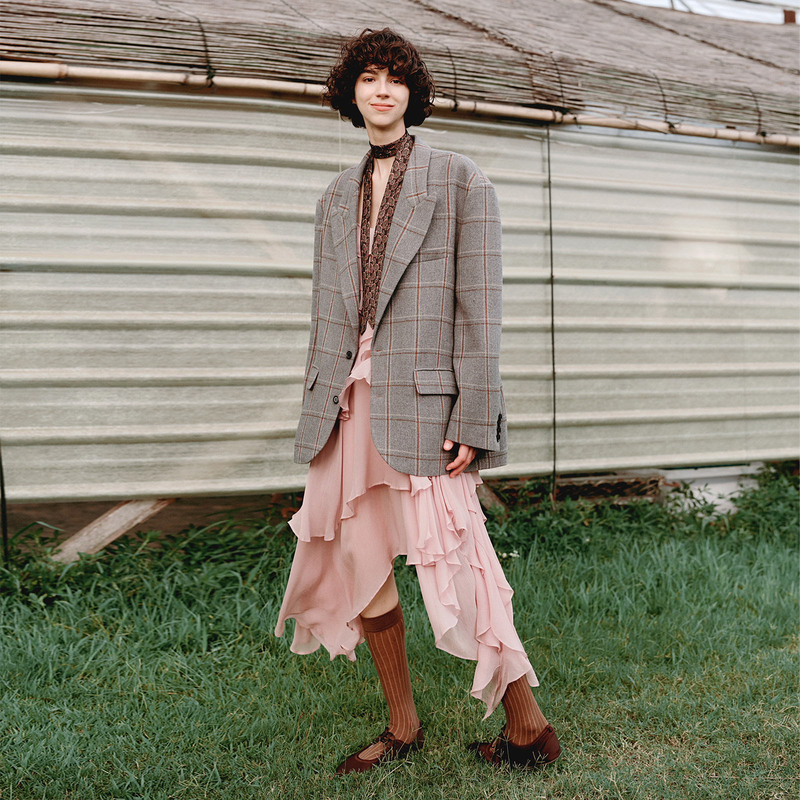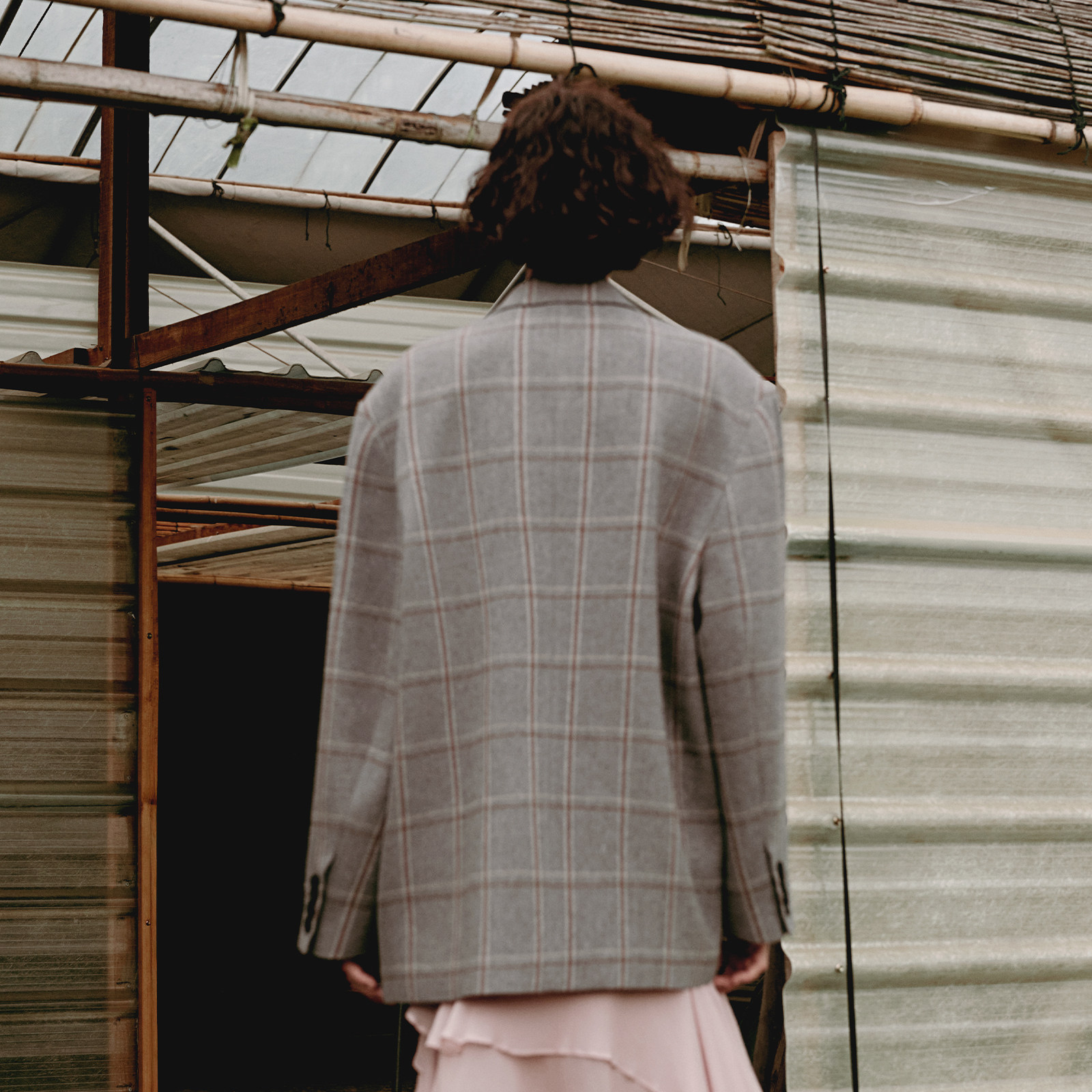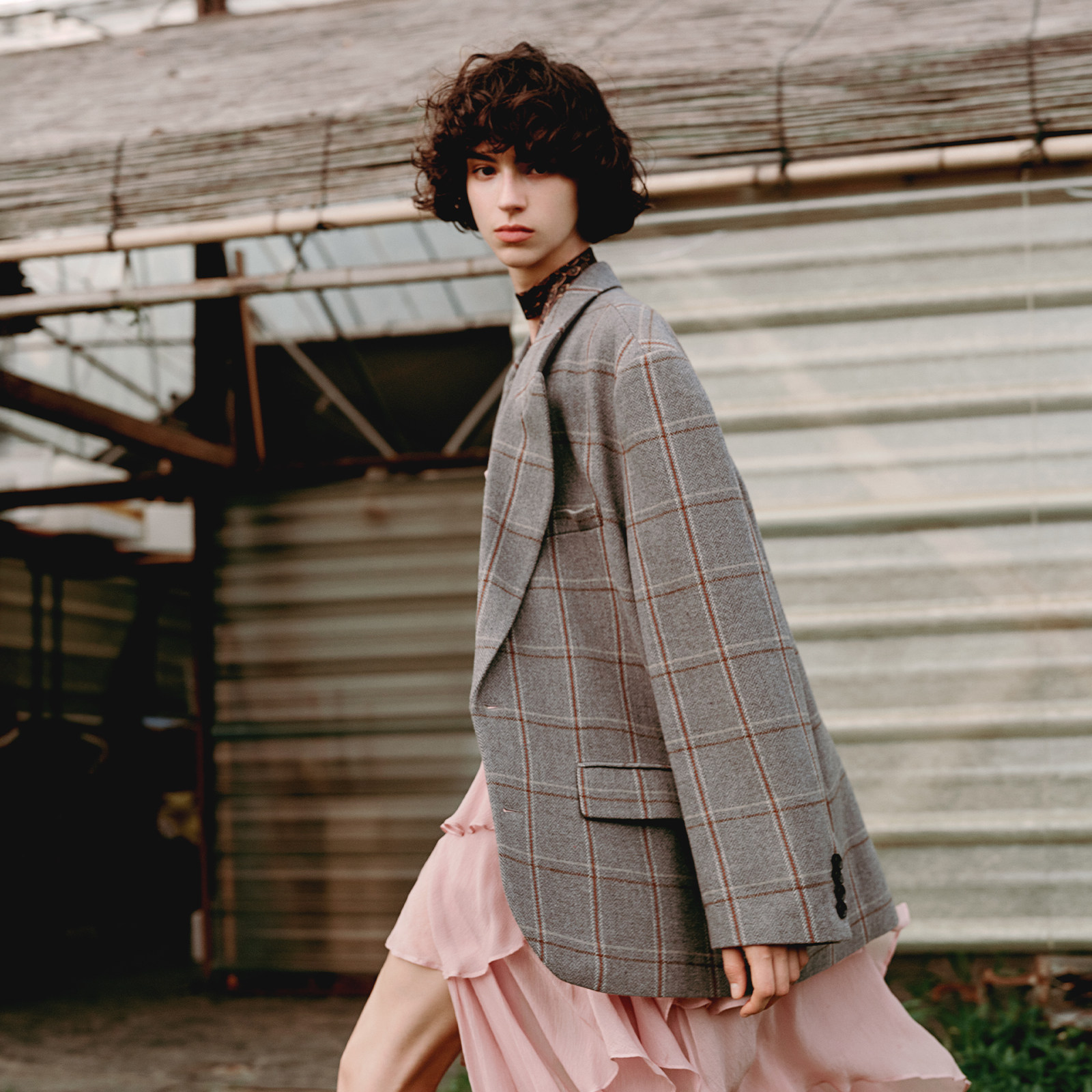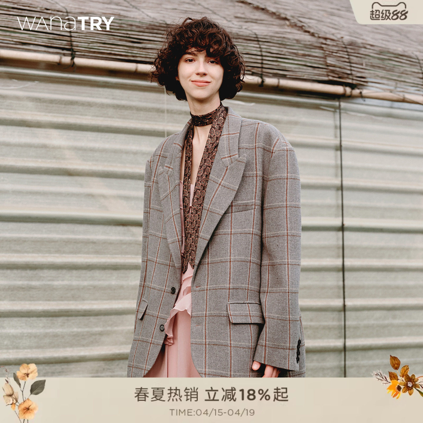 wana try羊毛格纹宽肩型廓形感灰色西服2025早秋新款气质女款外套