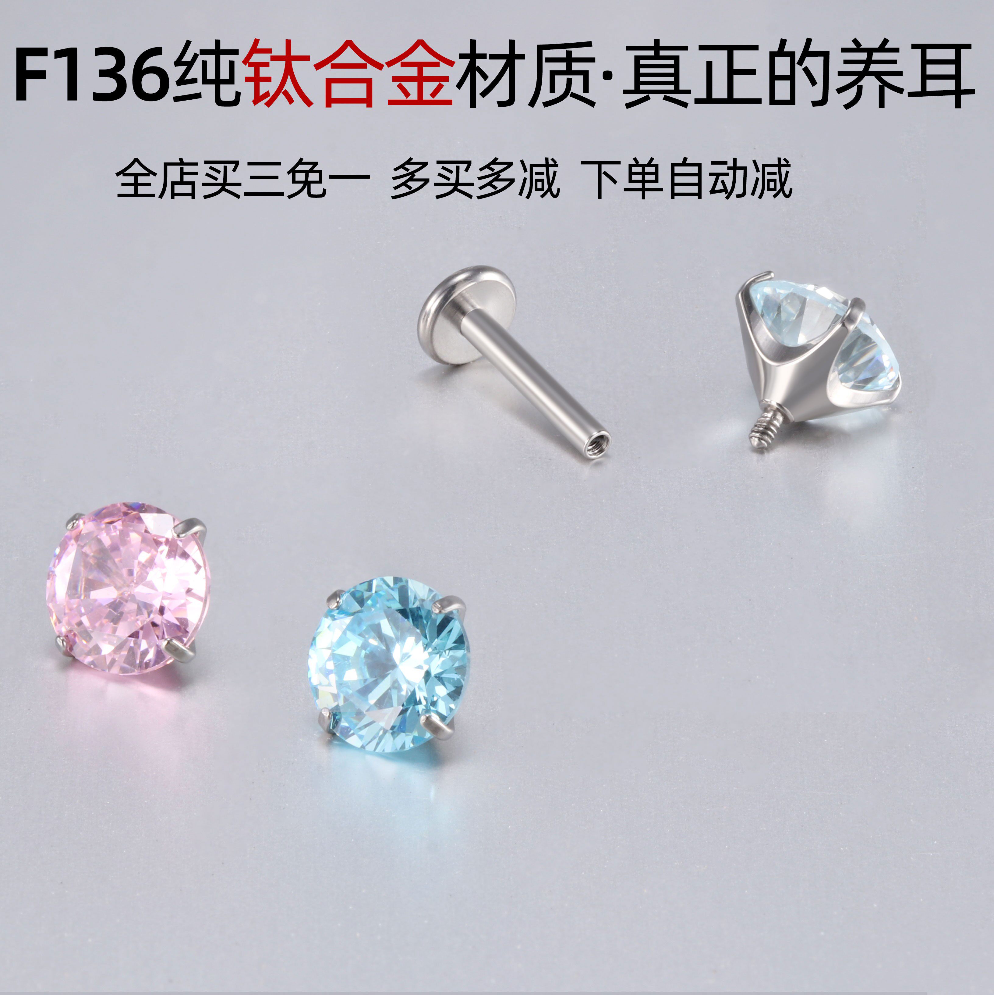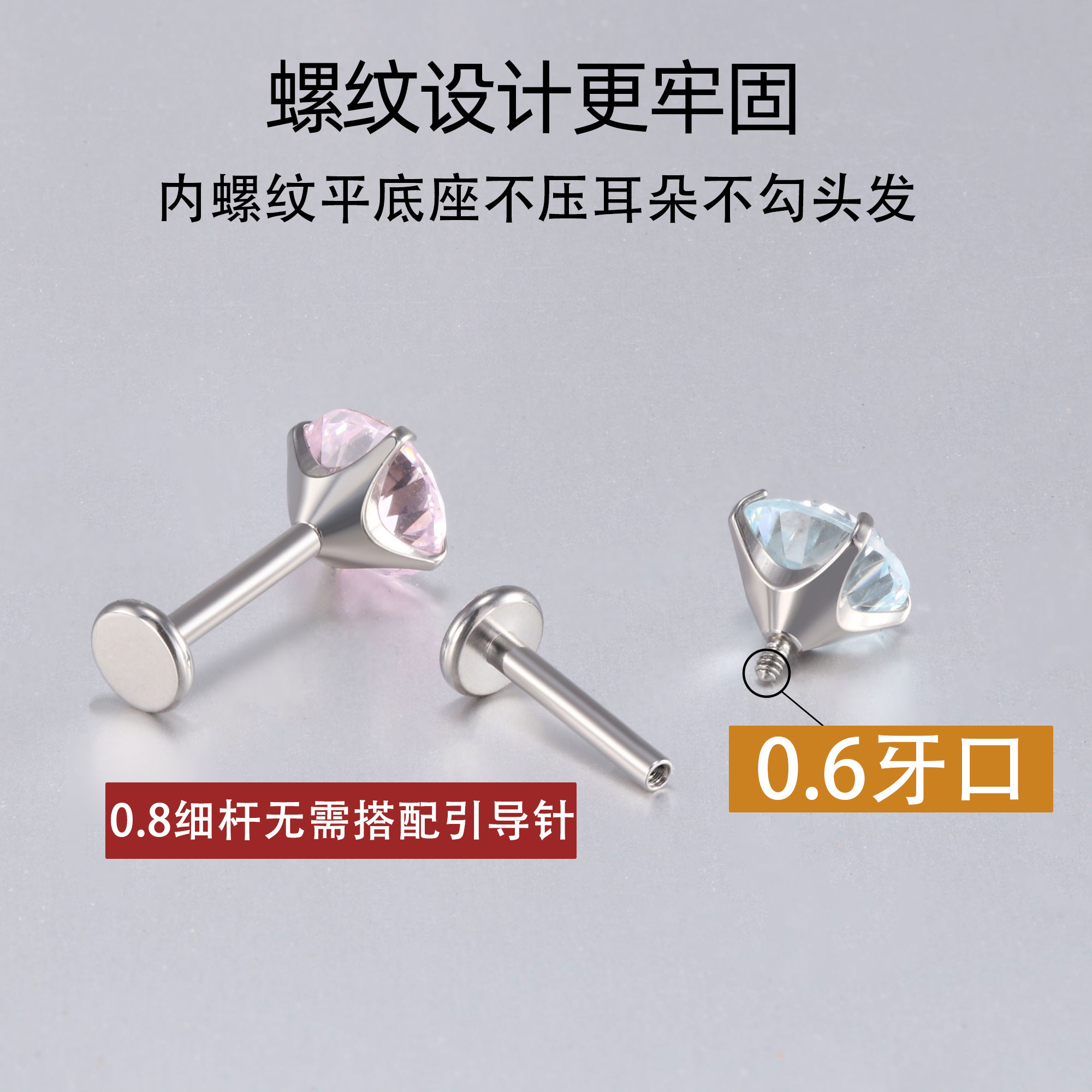 F136钛合金0.8细杆耳钉内螺旋平底养耳洞爆闪锆石耳蜗耳骨钉